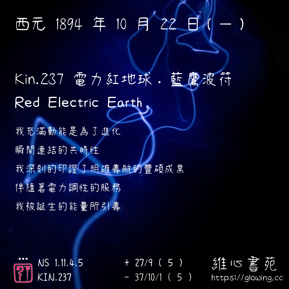 我們可以稱 KIN 237 為 【電力紅地球】 、 【電力的紅地球】 、 【藍鷹波符 之 電力紅地球】 也可以是 【電力紅地球.藍鷹波符】 ,你比較喜歡哪一個稱號呢?