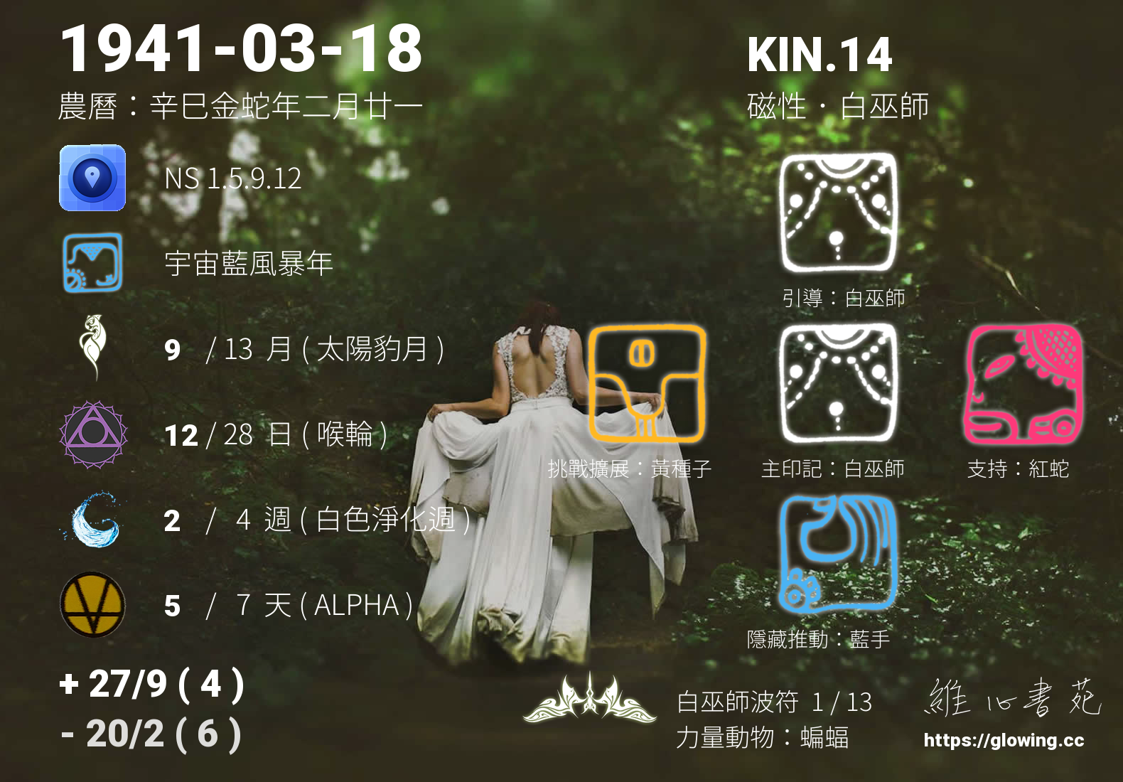 白巫師的引導依據KIN的調性不同會有五種可能性,KIN.14的引導圖騰是白巫師 , 白巫師引導著我們看見自己的不安,因為不安,所以我們尋求解答,因為不安,所以我在現實外,尋找安心的方向與方式。