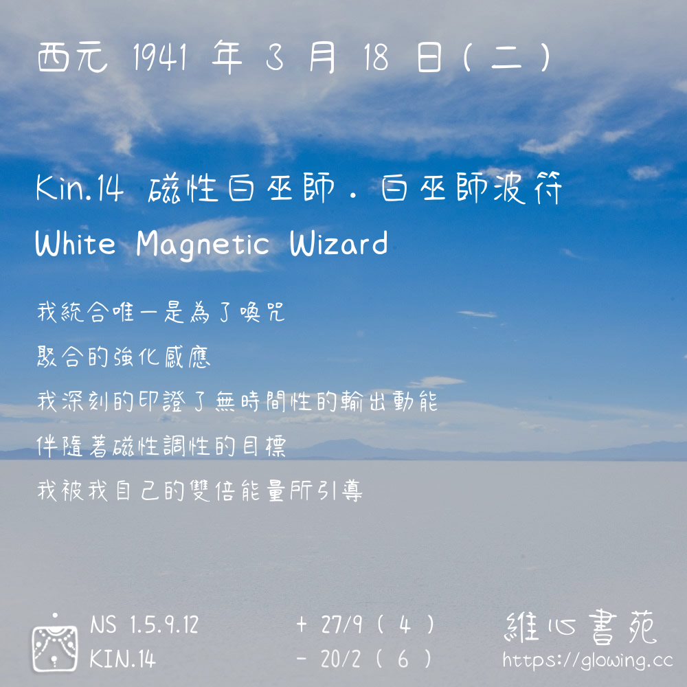 我們可以稱 KIN 14 為 【磁性白巫師】 、 【磁性的白巫師】 、 【白巫師波符 之 磁性白巫師】 也可以是 【磁性白巫師.白巫師波符】 ,你比較喜歡哪一個稱號呢?
