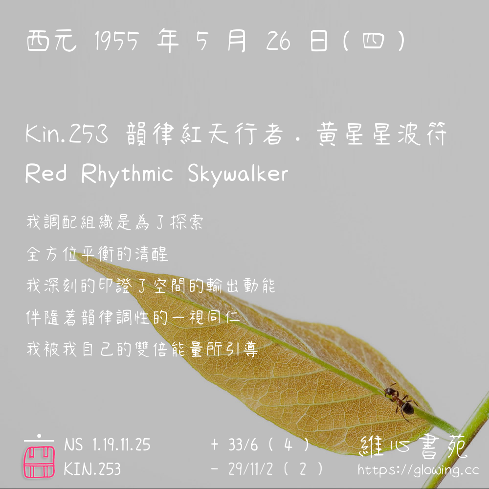 我們可以稱 KIN 253 為 【韻律紅天行者】 、 【韻律的紅天行者】 、 【黃星星波符 之 韻律紅天行者】 也可以是 【韻律紅天行者.黃星星波符】 ,你比較喜歡哪一個稱號呢?