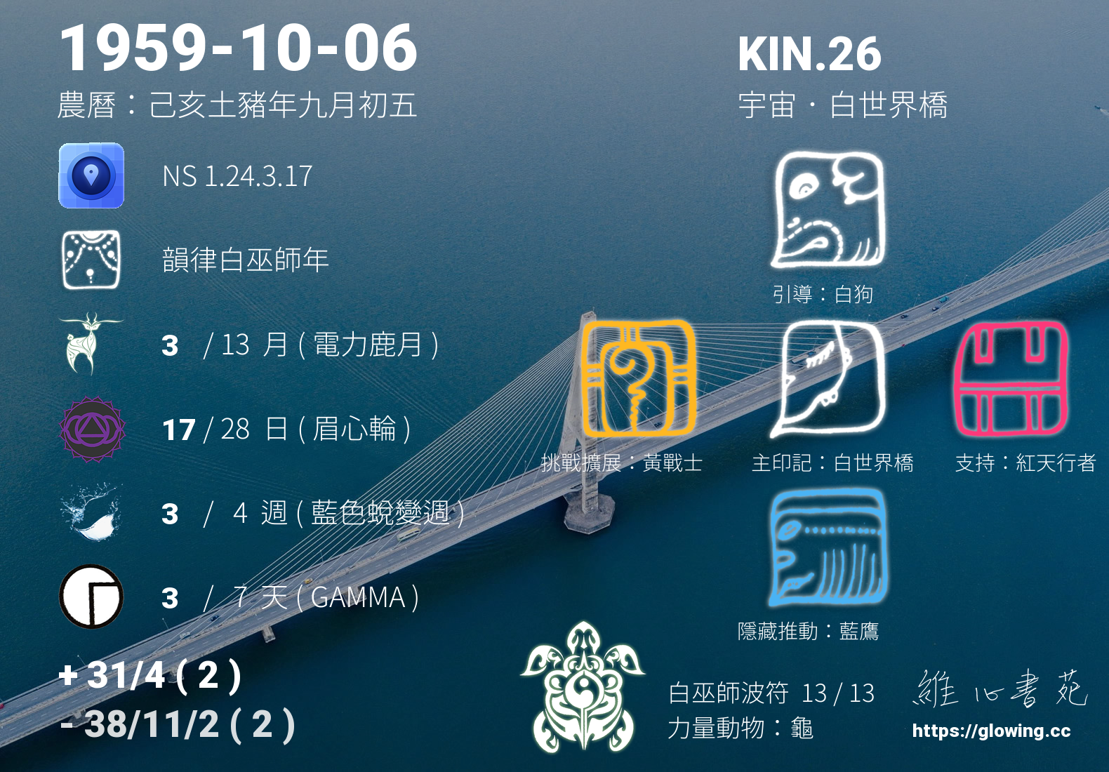 白世界橋的引導依據KIN的調性不同會有五種可能性,KIN.26的引導圖騰是白狗 , 沒有白狗的引導,我們沒有辦法體會到具象的愛,真實的能量流動,需要伴隨著具象的行為模式,白狗的愛相當的純粹、自然且生動現實,我們可以全然的接受,那發自內心毫無一絲污漬的潔淨純白。