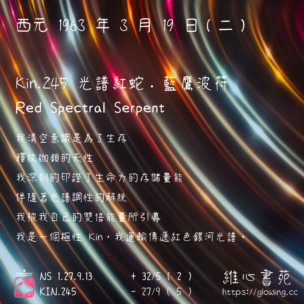我們可以稱 KIN 245 為 【光譜紅蛇】 、 【光譜的紅蛇】 、 【藍鷹波符 之 光譜紅蛇】 也可以是 【光譜紅蛇.藍鷹波符】 ,你比較喜歡哪一個稱號呢?