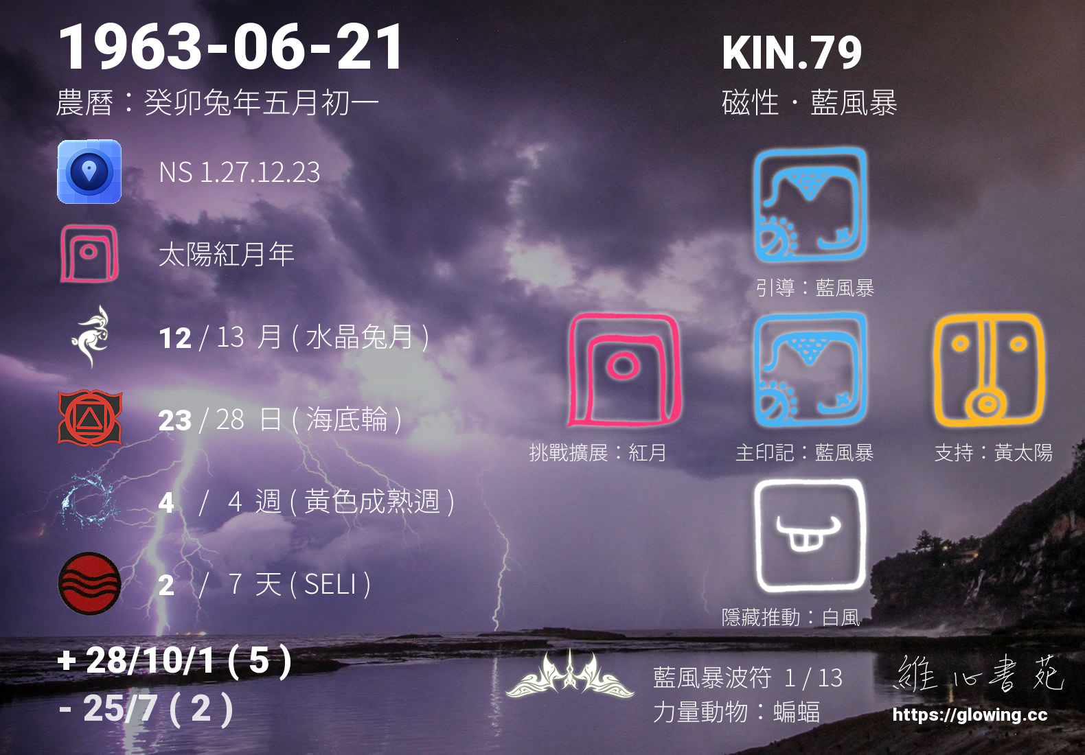 藍風暴的引導依據KIN的調性不同會有五種可能性,KIN.79的引導圖騰是藍風暴 , 藍風暴引領著我們誠心地祈求,祈求一切歸於虛無,因為所有的一切始於空,也將終於空,我們帶不走任何一絲一毫的能量,我們能做的就僅僅是意識到,我們終將回歸,如此而已。