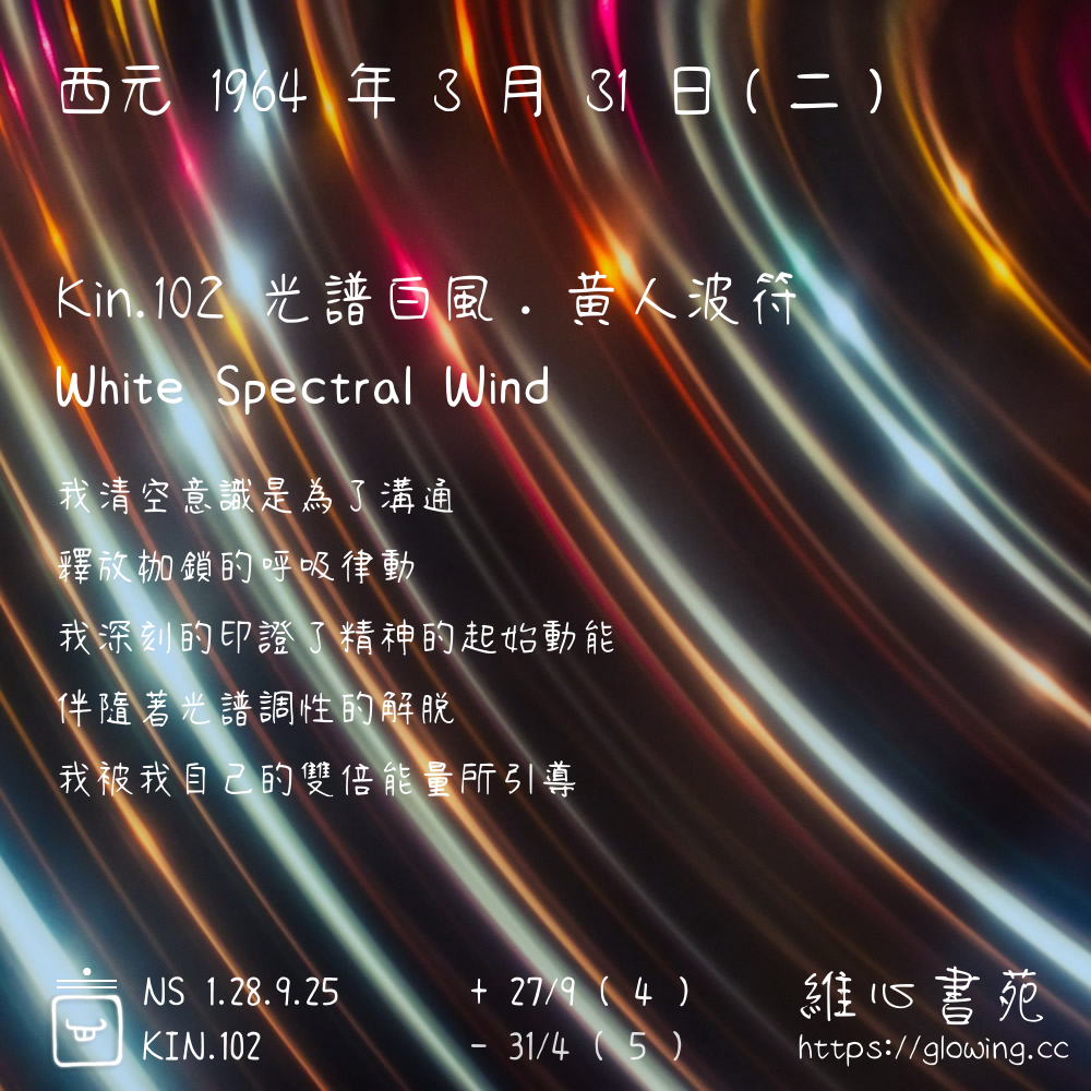 我們可以稱 KIN 102 為 【光譜白風】 、 【光譜的白風】 、 【黃人波符 之 光譜白風】 也可以是 【光譜白風.黃人波符】 ,你比較喜歡哪一個稱號呢?