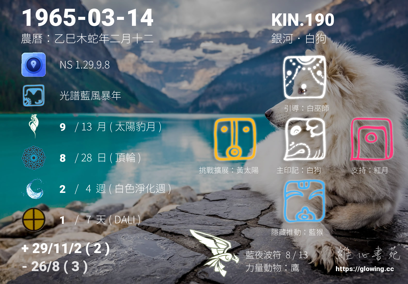 白狗的引導依據KIN的調性不同會有五種可能性,KIN.190的引導圖騰是白巫師 , 白巫師引導著我們看見自己的不安,因為不安,所以我們尋求解答,因為不安,所以我在現實外,尋找安心的方向與方式。