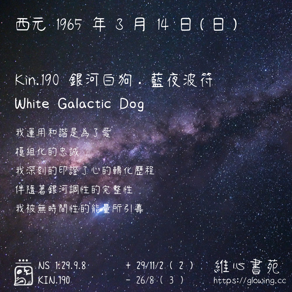 我們可以稱 KIN 190 為 【銀河白狗】 、 【銀河的白狗】 、 【藍夜波符 之 銀河白狗】 也可以是 【銀河白狗.藍夜波符】 ,你比較喜歡哪一個稱號呢?