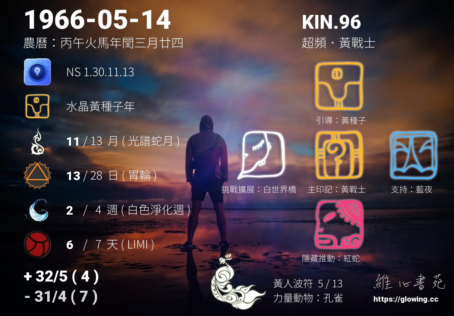 我們可以稱 KIN 96 為 【超頻黃戰士】 、 【超頻的黃戰士】 、 【黃人波符 之 超頻黃戰士】 也可以是 【超頻黃戰士.黃人波符】 ,你比較喜歡哪一個稱號呢?