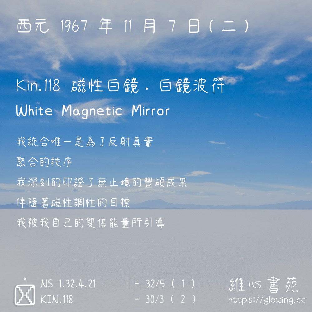 我們可以稱 KIN 118 為 【磁性白鏡】 、 【磁性的白鏡】 、 【白鏡波符 之 磁性白鏡】 也可以是 【磁性白鏡.白鏡波符】 ,你比較喜歡哪一個稱號呢?
