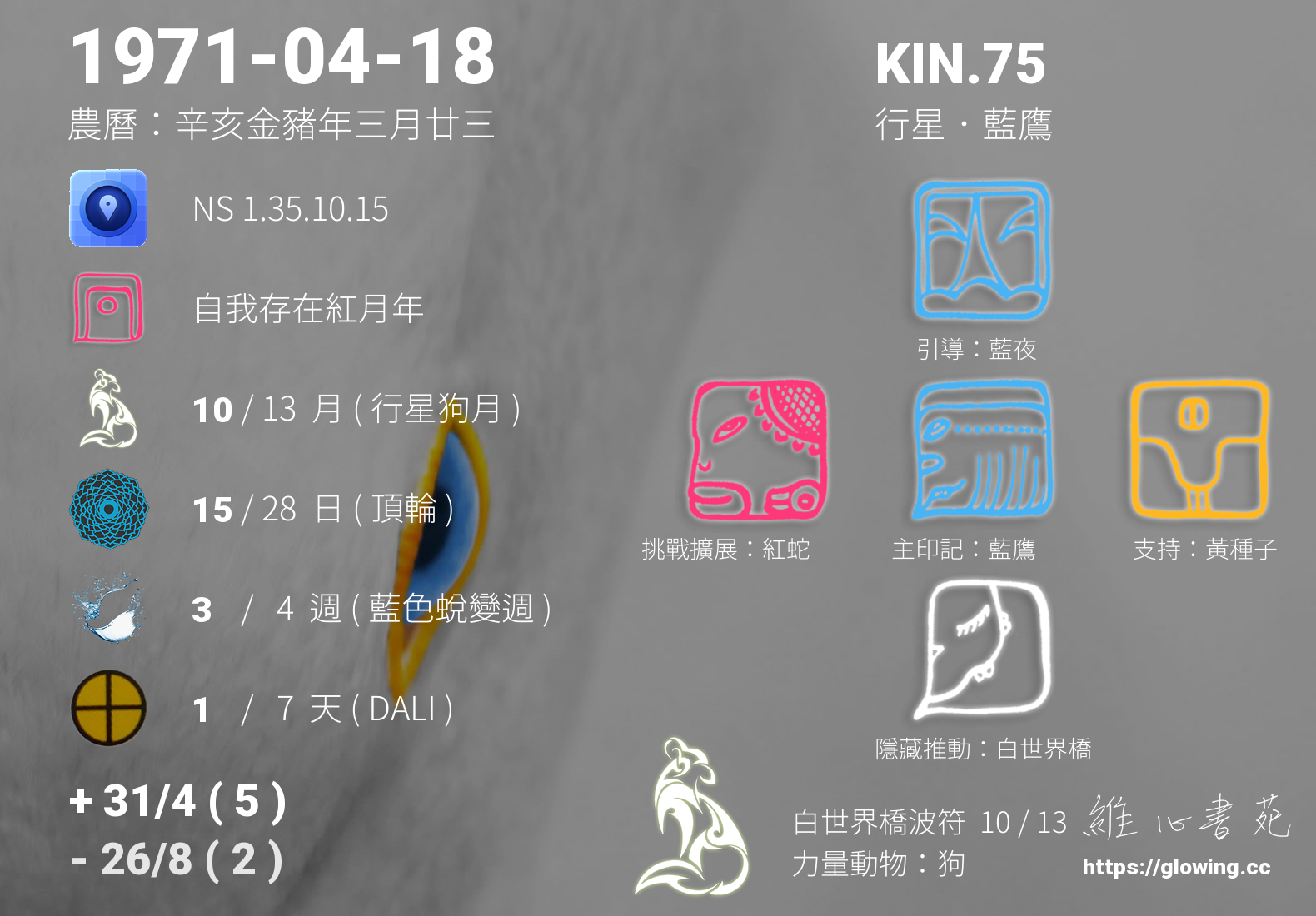 我們可以稱 KIN 75 為 【行星藍鷹】 、 【行星的藍鷹】 、 【白世界橋波符 之 行星藍鷹】 也可以是 【行星藍鷹.白世界橋波符】 ,你比較喜歡哪一個稱號呢?