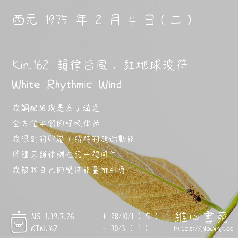 我們可以稱 KIN 162 為 【韻律白風】 、 【韻律的白風】 、 【紅地球波符 之 韻律白風】 也可以是 【韻律白風.紅地球波符】 ,你比較喜歡哪一個稱號呢?