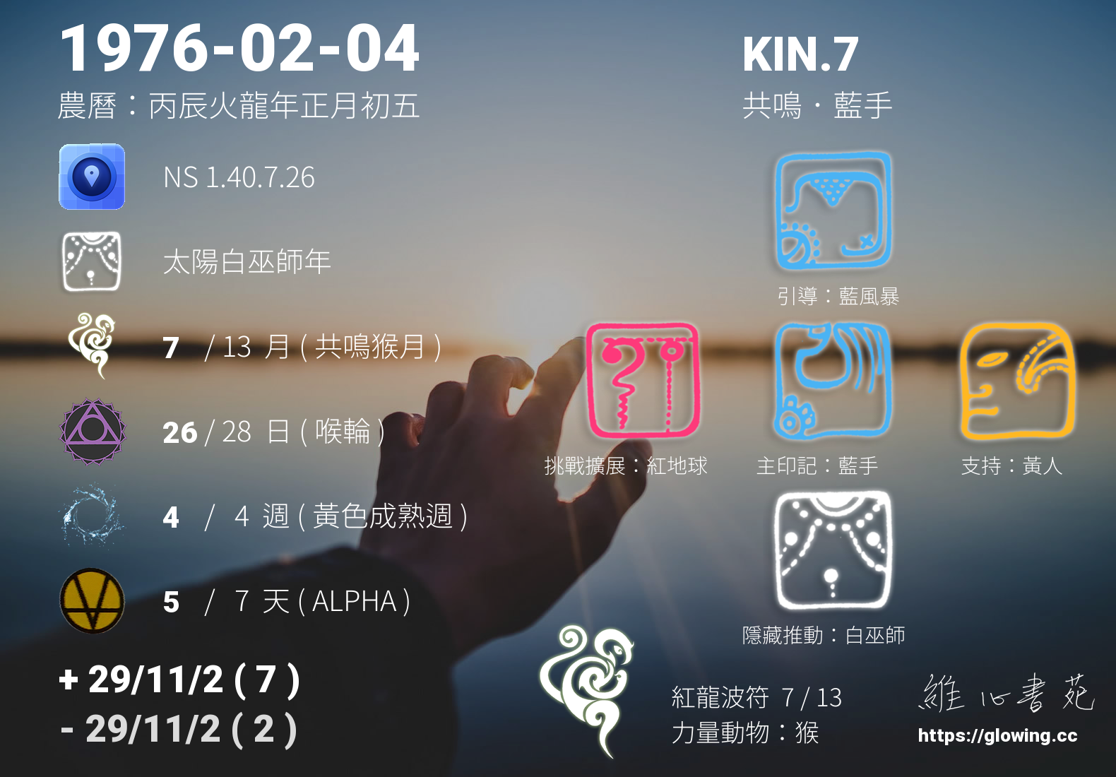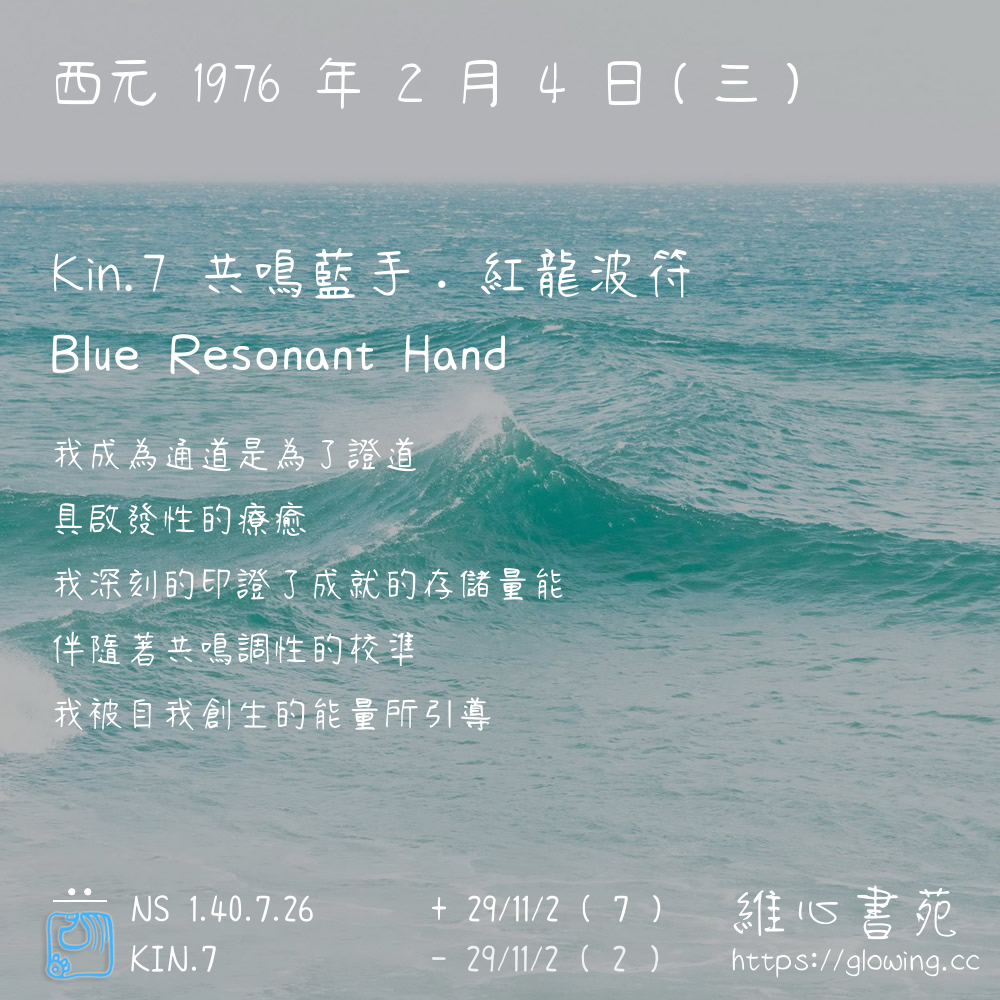 我們可以稱 KIN 7 為 【共鳴藍手】 、 【共鳴的藍手】 、 【紅龍波符 之 共鳴藍手】 也可以是 【共鳴藍手.紅龍波符】 ,你比較喜歡哪一個稱號呢?
