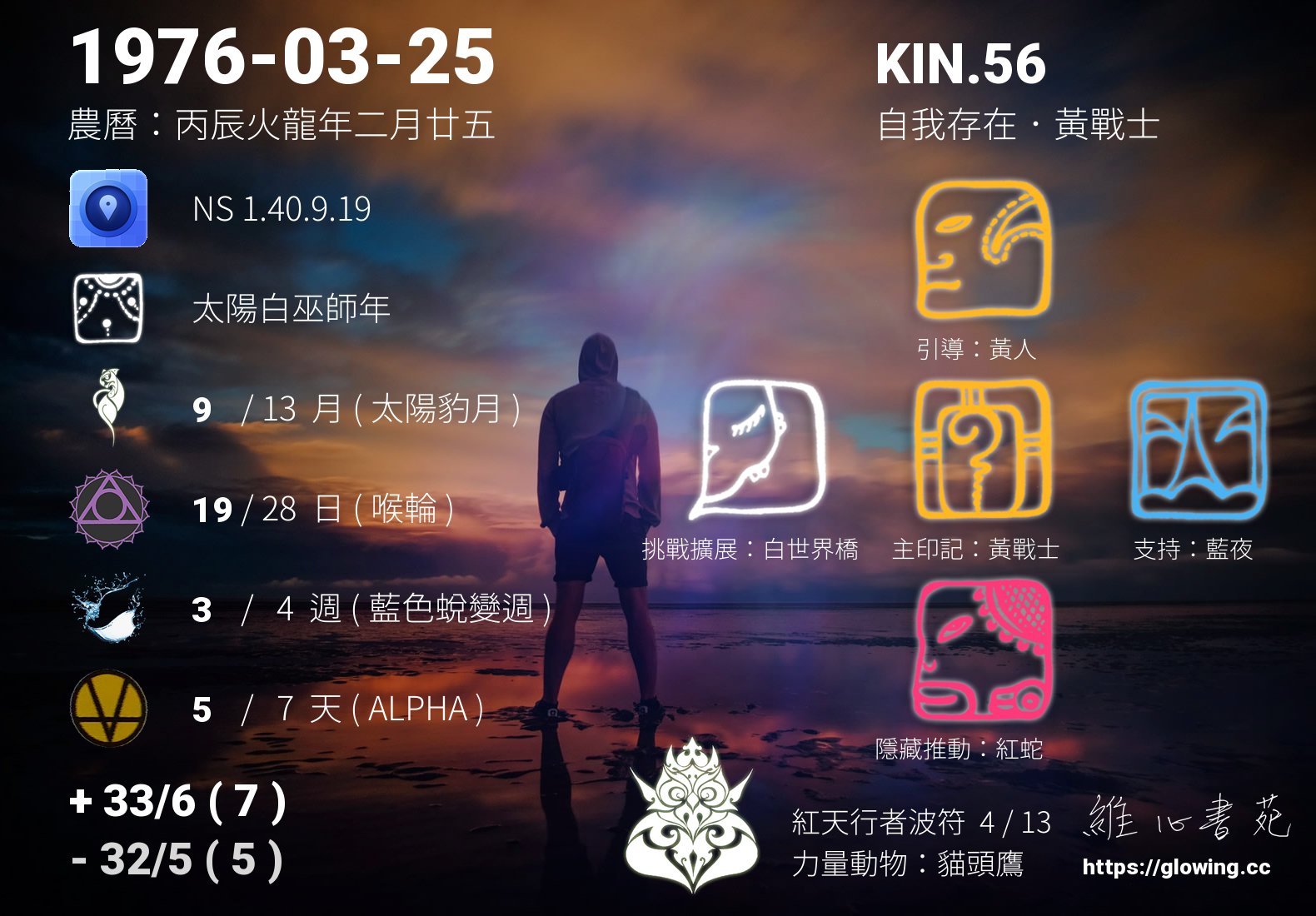 我們可以稱 KIN 56 為 【自我存在黃戰士】 、 【自我存在的黃戰士】 、 【紅天行者波符 之 自我存在黃戰士】 也可以是 【自我存在黃戰士.紅天行者波符】 ,你比較喜歡哪一個稱號呢?