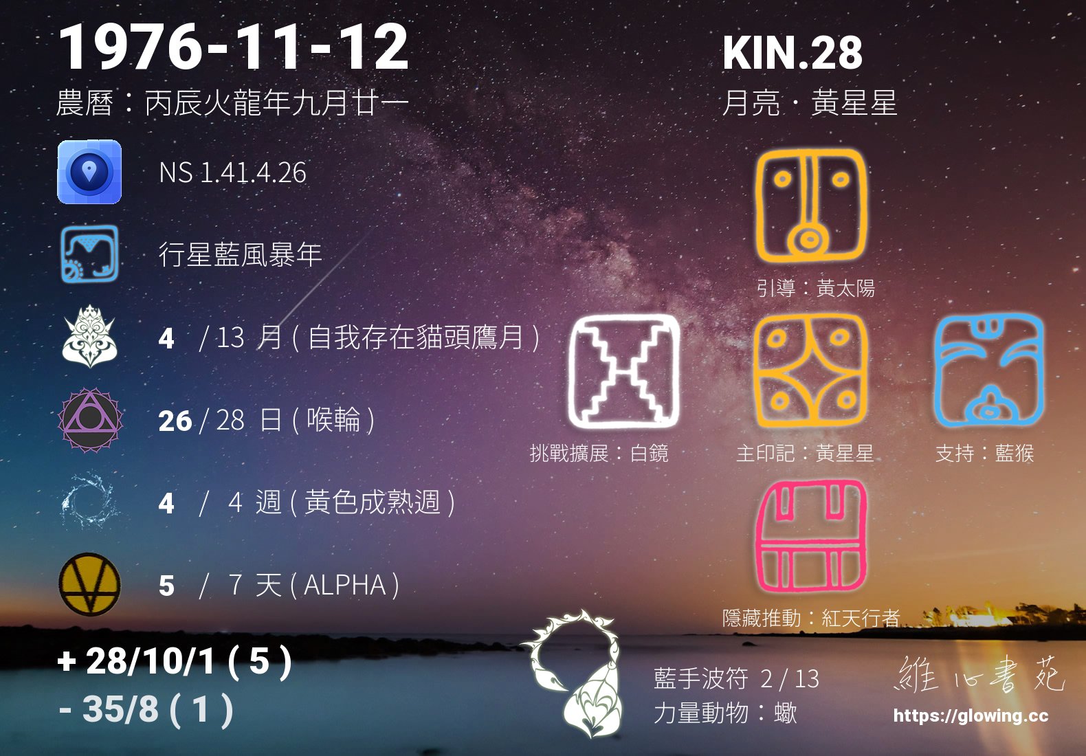 我們可以稱 KIN 28 為 【月亮黃星星】 、 【月亮的黃星星】 、 【藍手波符 之 月亮黃星星】 也可以是 【月亮黃星星.藍手波符】 ,你比較喜歡哪一個稱號呢?