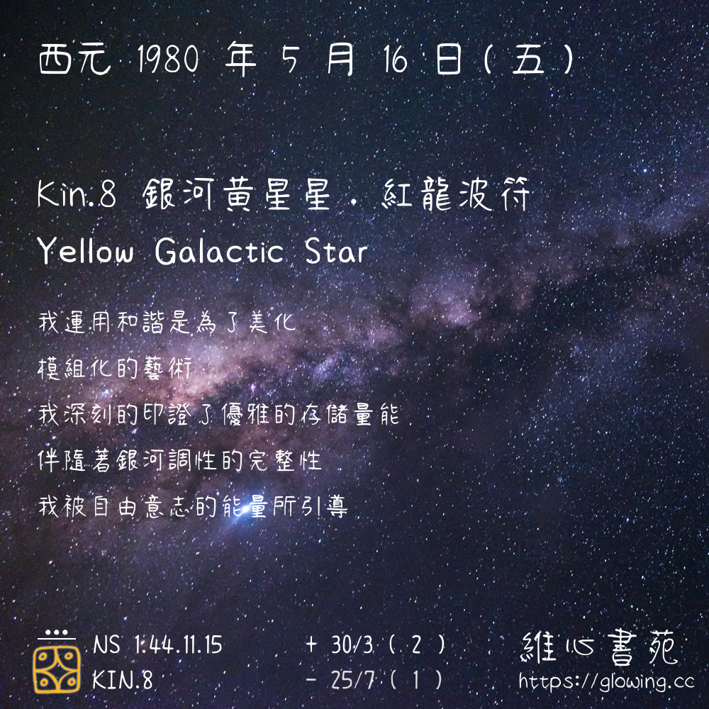 我們可以稱 KIN 8 為 【銀河黃星星】 、 【銀河的黃星星】 、 【紅龍波符 之 銀河黃星星】 也可以是 【銀河黃星星.紅龍波符】 ,你比較喜歡哪一個稱號呢?