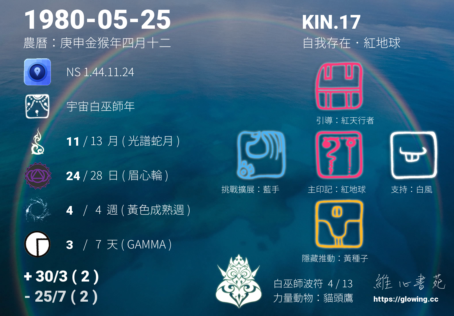 紅地球的引導依據KIN的調性不同會有五種可能性,KIN.17的引導圖騰是紅天行者 , 紅天行者引導著我們往更高遠的天體運行仰望,神聖的力量不在宗教不在聖所,在我們行走的路上,我們所識的萬事萬物都是神聖的一部分,我們走一步,靈魂算一步,每一步都堅實且美麗,對應天體運行,逐夢踏實。