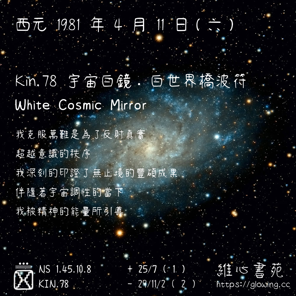 我們可以稱 KIN 78 為 【宇宙白鏡】 、 【宇宙的白鏡】 、 【白世界橋波符 之 宇宙白鏡】 也可以是 【宇宙白鏡.白世界橋波符】 ,你比較喜歡哪一個稱號呢?