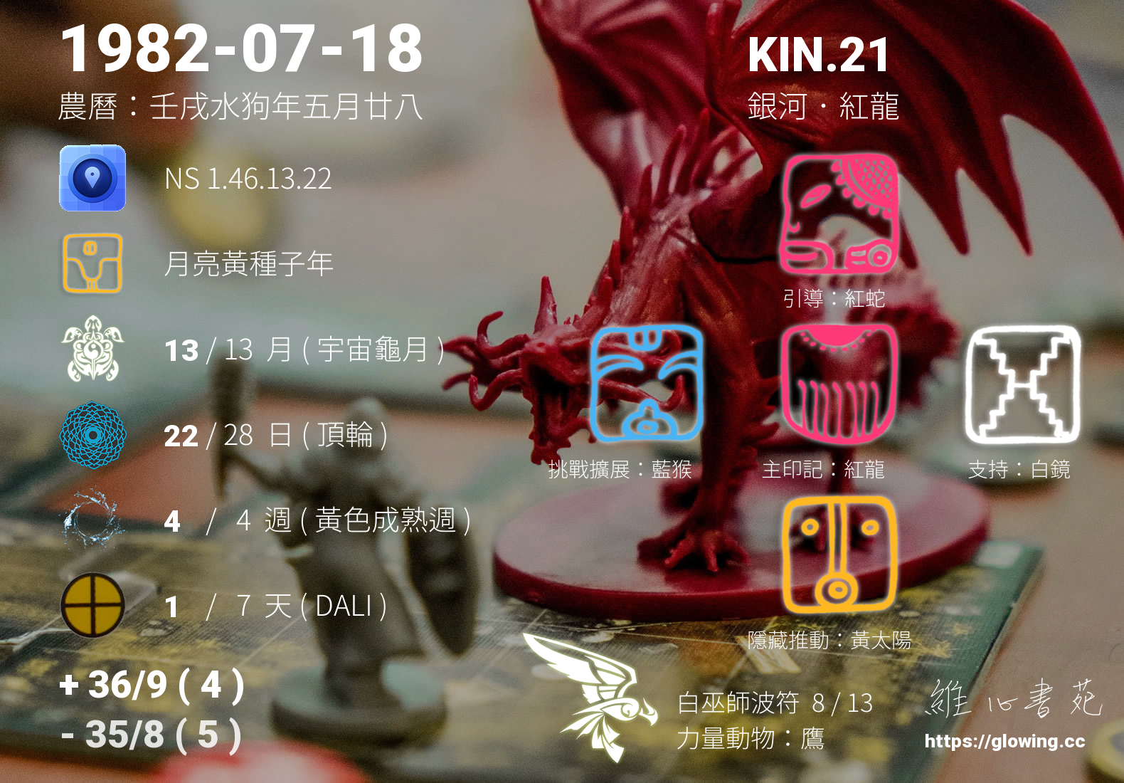 今天的星際原型圖騰為紅龍,我們稱之為主印記, 紅龍是卓爾金曆的第一個圖騰,代表著生命的起源與創造,跟家庭的緣分深刻,動能豐沛。