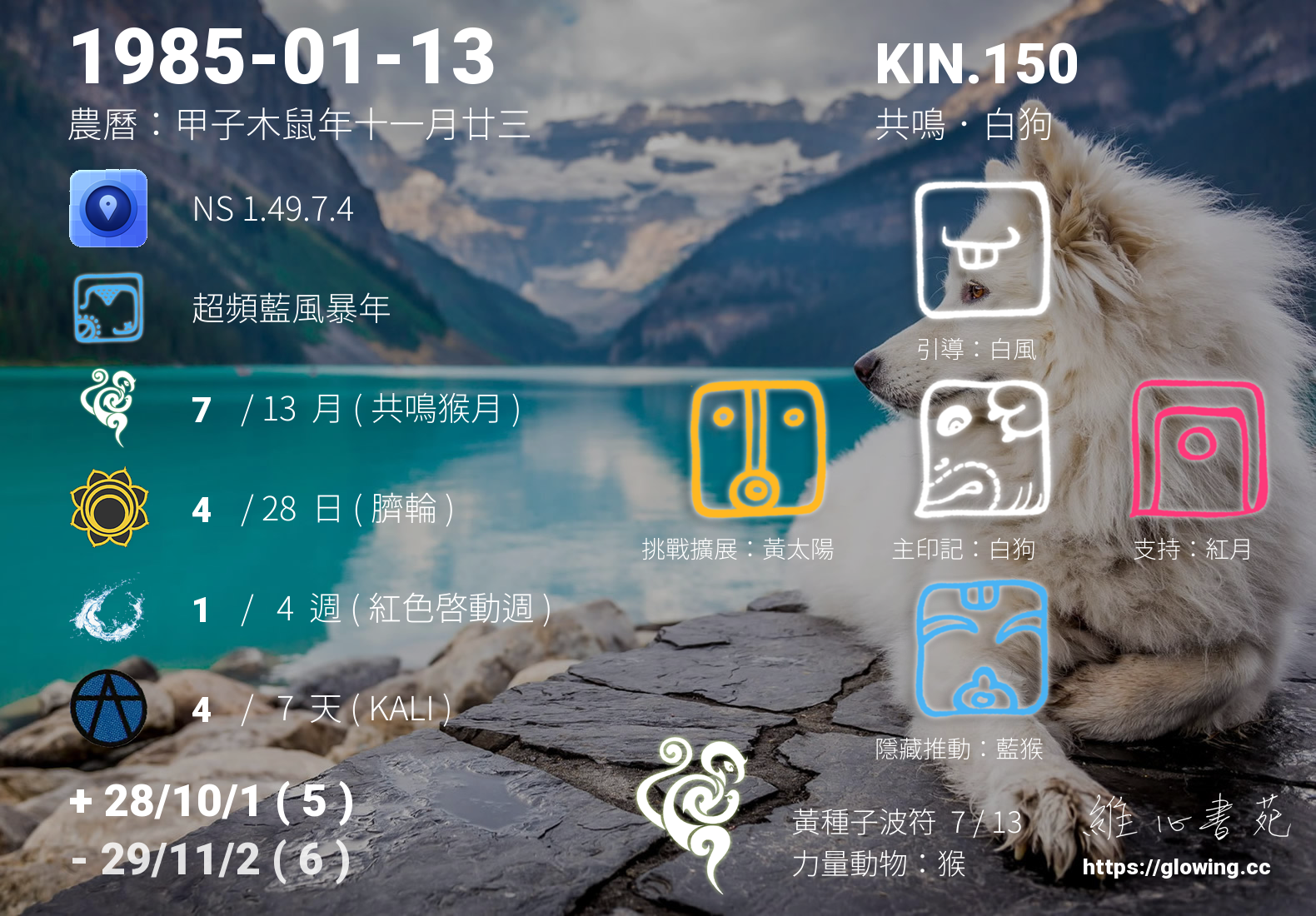 我們可以稱 KIN 150 為 【共鳴白狗】 、 【共鳴的白狗】 、 【黃種子波符 之 共鳴白狗】 也可以是 【共鳴白狗.黃種子波符】 ,你比較喜歡哪一個稱號呢?
