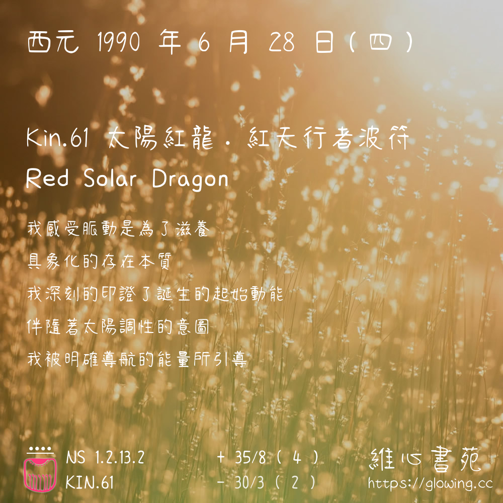 我們可以稱 KIN 61 為 【太陽紅龍】 、 【太陽的紅龍】 、 【紅天行者波符 之 太陽紅龍】 也可以是 【太陽紅龍.紅天行者波符】 ,你比較喜歡哪一個稱號呢?