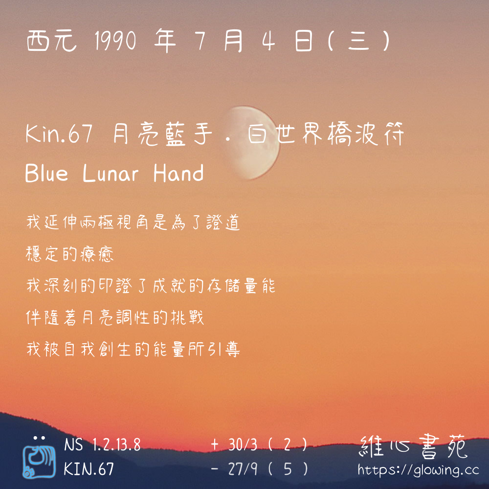 我們可以稱 KIN 67 為 【月亮藍手】 、 【月亮的藍手】 、 【白世界橋波符 之 月亮藍手】 也可以是 【月亮藍手.白世界橋波符】 ,你比較喜歡哪一個稱號呢?