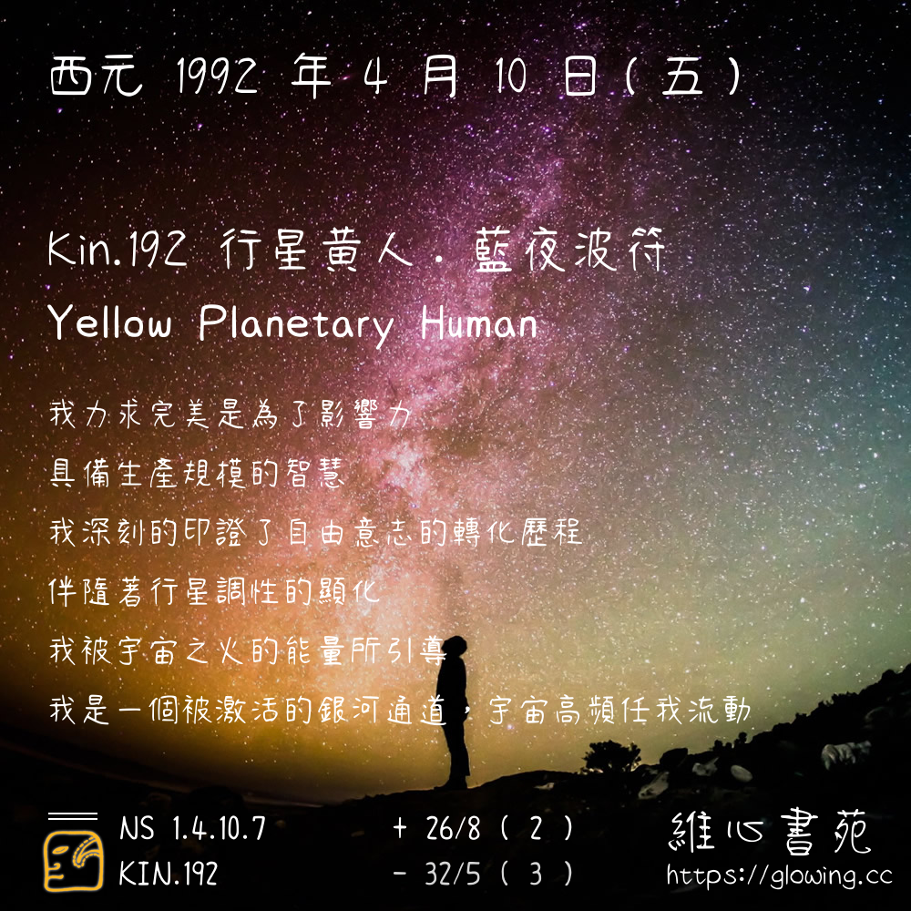我們可以稱 KIN 192 為 【行星黃人】 、 【行星的黃人】 、 【藍夜波符 之 行星黃人】 也可以是 【行星黃人.藍夜波符】 ,你比較喜歡哪一個稱號呢?