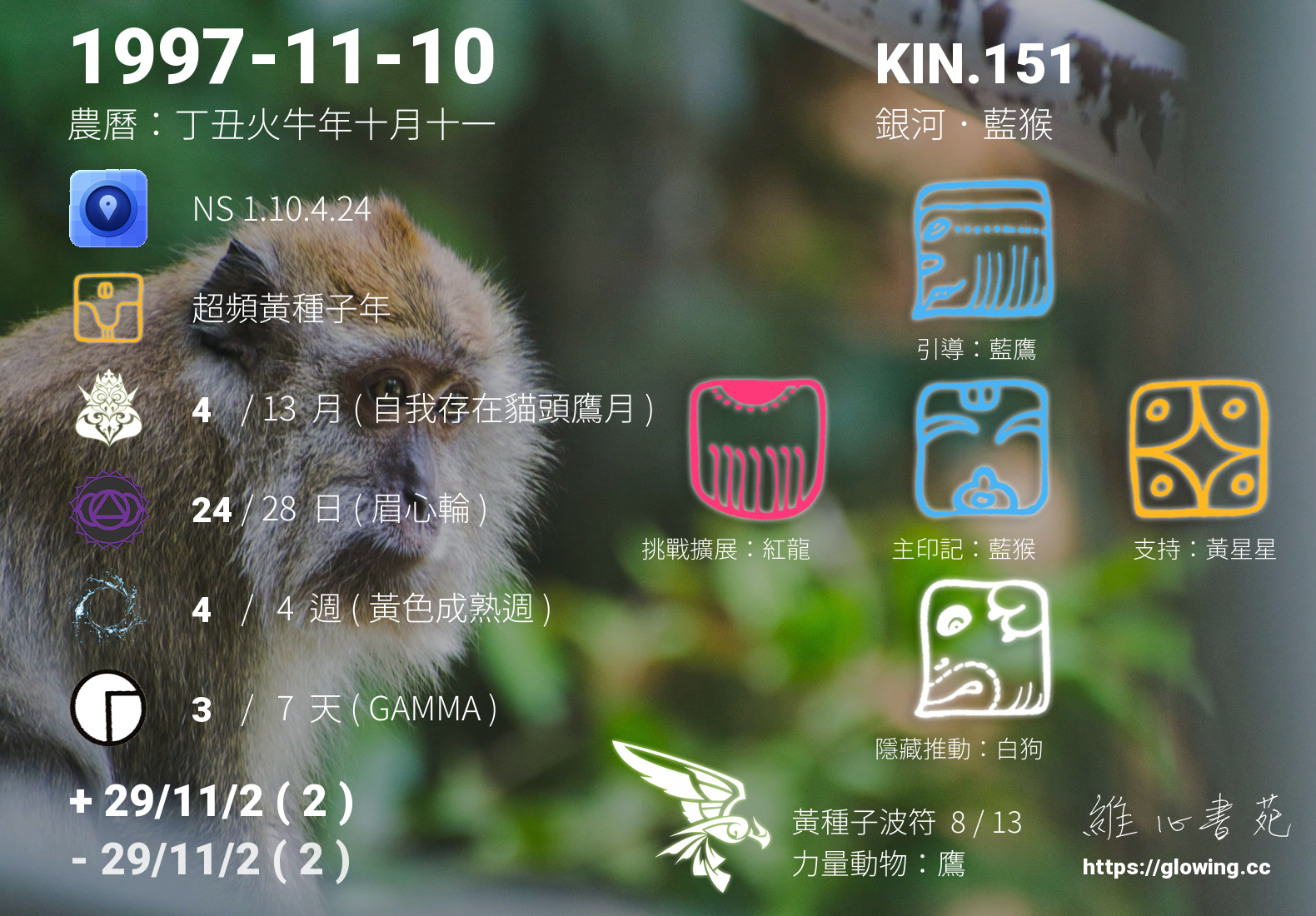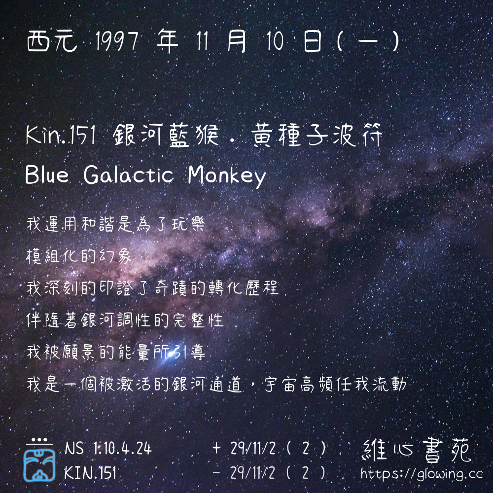 我們可以稱 KIN 151 為 【銀河藍猴】 、 【銀河的藍猴】 、 【黃種子波符 之 銀河藍猴】 也可以是 【銀河藍猴.黃種子波符】 ,你比較喜歡哪一個稱號呢?