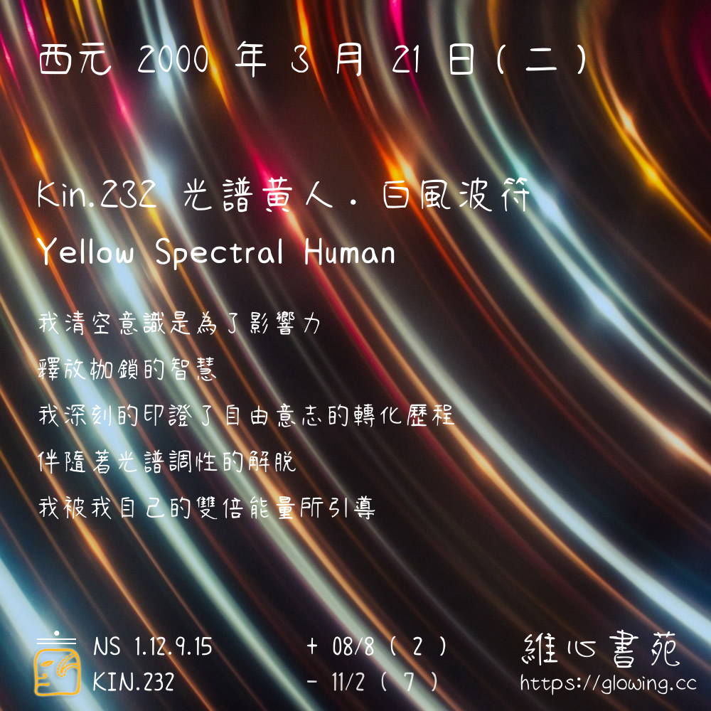 我們可以稱 KIN 232 為 【光譜黃人】 、 【光譜的黃人】 、 【白風波符 之 光譜黃人】 也可以是 【光譜黃人.白風波符】 ,你比較喜歡哪一個稱號呢?