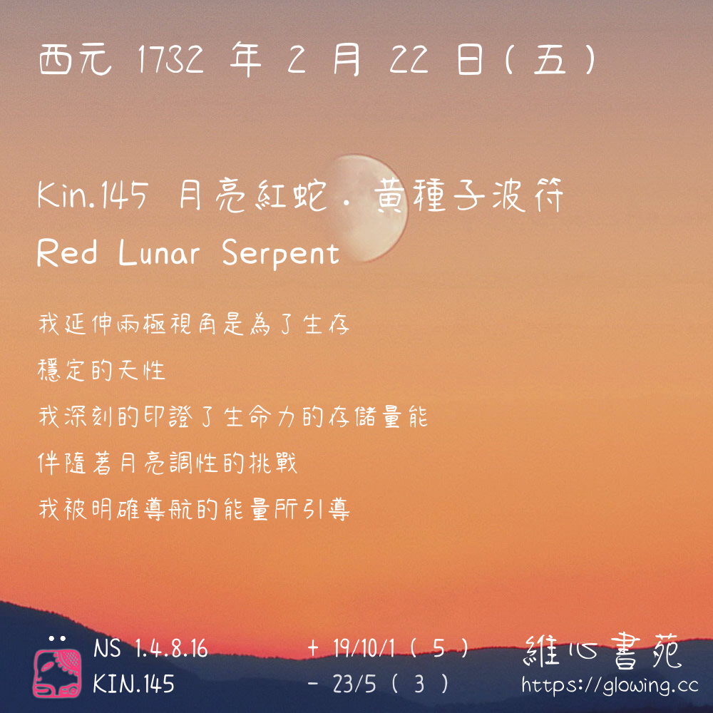 我們可以稱 KIN 145 為 【月亮紅蛇】 、 【月亮的紅蛇】 、 【黃種子波符 之 月亮紅蛇】 也可以是 【月亮紅蛇.黃種子波符】 ,你比較喜歡哪一個稱號呢?