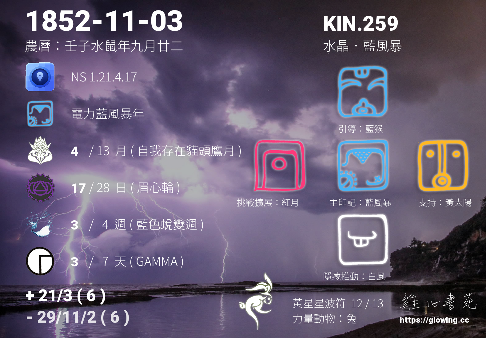 我們可以稱 KIN 259 為 【水晶藍風暴】 、 【水晶的藍風暴】 、 【黃星星波符 之 水晶藍風暴】 也可以是 【水晶藍風暴.黃星星波符】 ,你比較喜歡哪一個稱號呢?