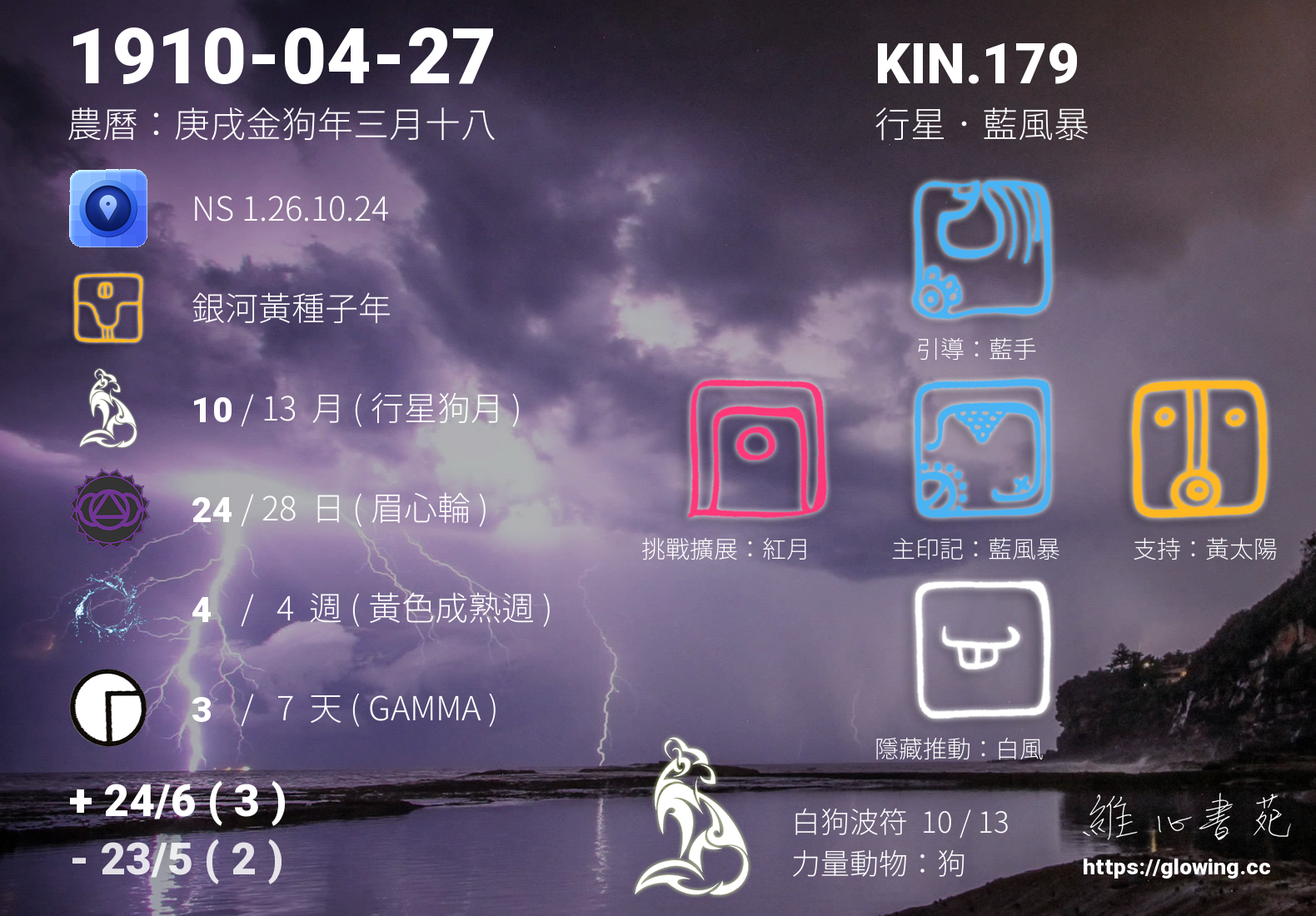 我們可以稱 KIN 179 為 【行星藍風暴】 、 【行星的藍風暴】 、 【白狗波符 之 行星藍風暴】 也可以是 【行星藍風暴.白狗波符】 ,你比較喜歡哪一個稱號呢?