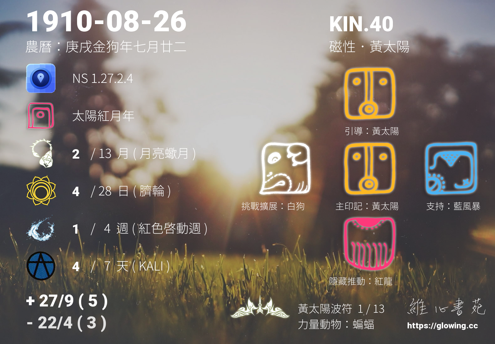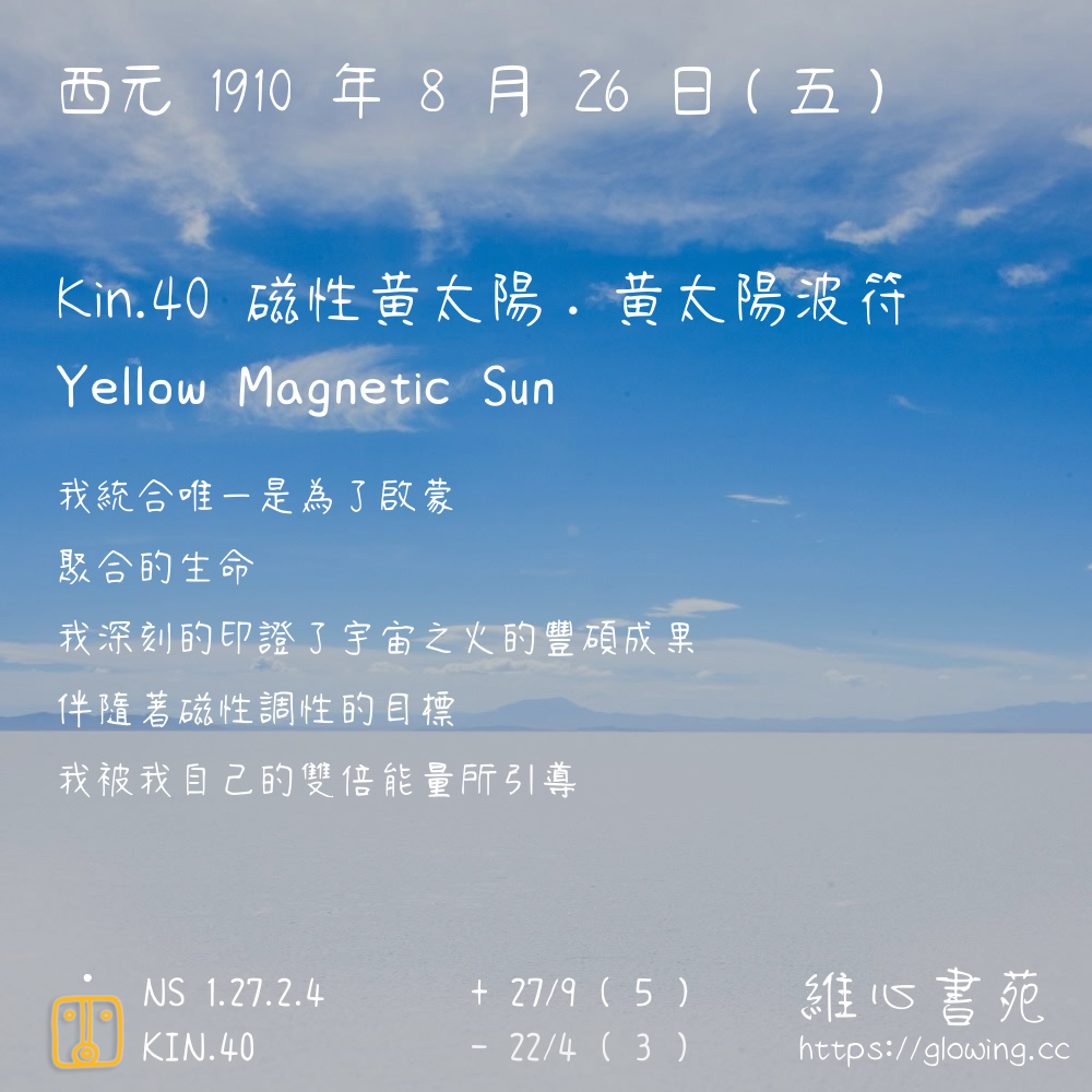 我們可以稱 KIN 40 為 【磁性黃太陽】 、 【磁性的黃太陽】 、 【黃太陽波符 之 磁性黃太陽】 也可以是 【磁性黃太陽.黃太陽波符】 ,你比較喜歡哪一個稱號呢?