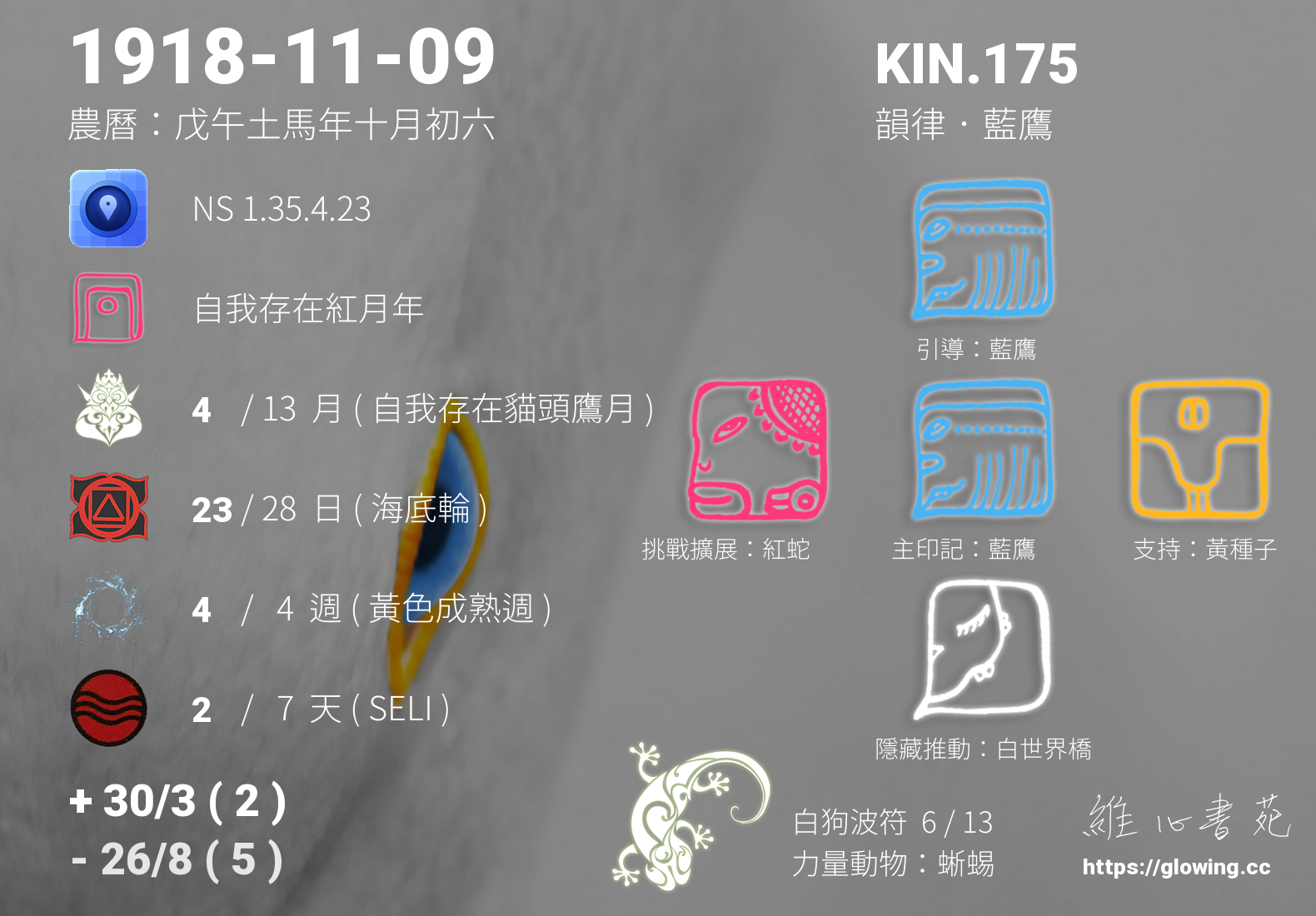 我們可以稱 KIN 175 為 【韻律藍鷹】 、 【韻律的藍鷹】 、 【白狗波符 之 韻律藍鷹】 也可以是 【韻律藍鷹.白狗波符】 ,你比較喜歡哪一個稱號呢?
