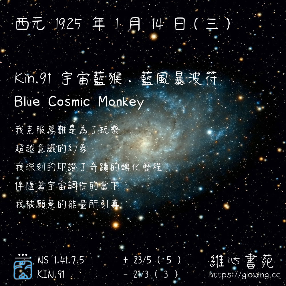 我們可以稱 KIN 91 為 【宇宙藍猴】 、 【宇宙的藍猴】 、 【藍風暴波符 之 宇宙藍猴】 也可以是 【宇宙藍猴.藍風暴波符】 ,你比較喜歡哪一個稱號呢?