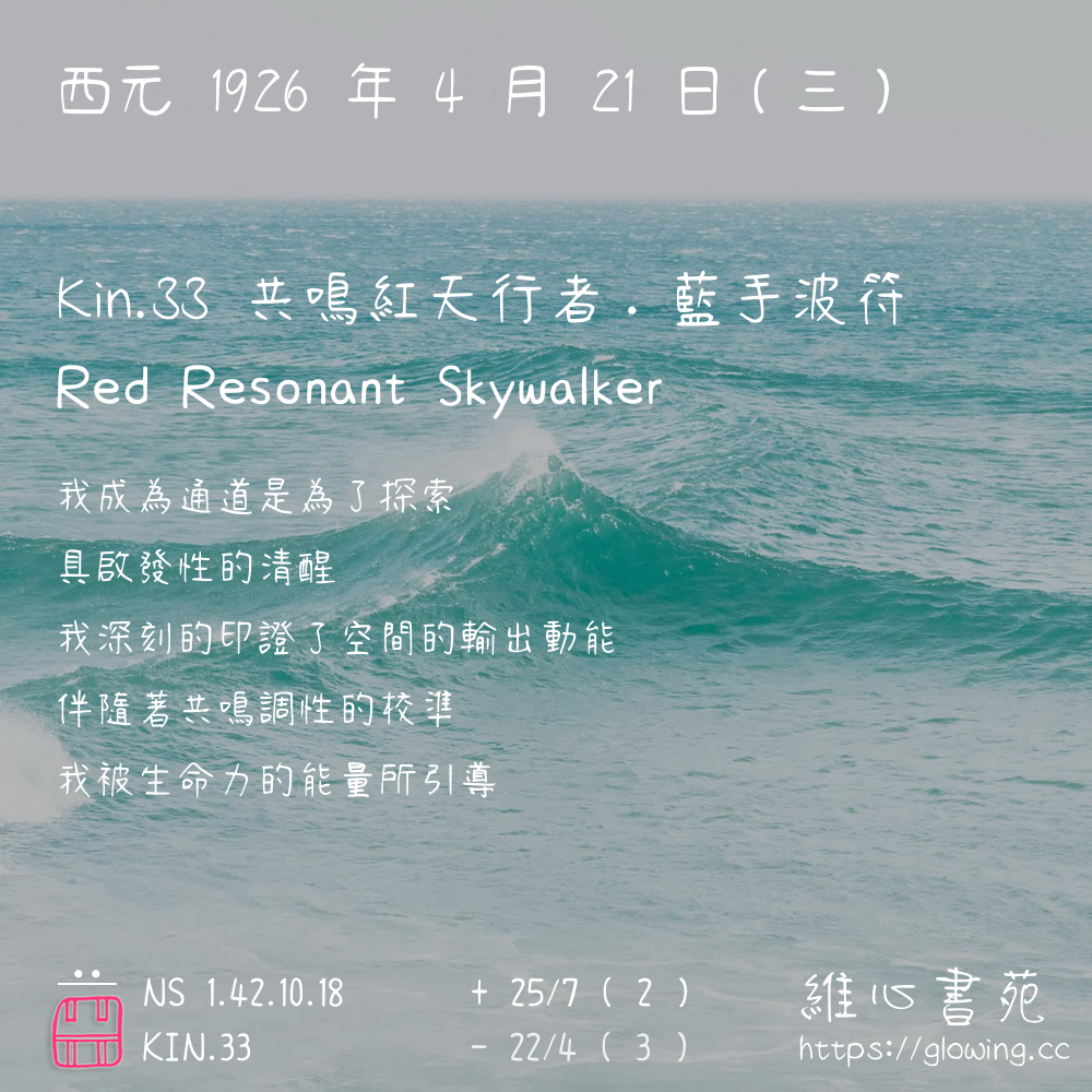 我們可以稱 KIN 33 為 【共鳴紅天行者】 、 【共鳴的紅天行者】 、 【藍手波符 之 共鳴紅天行者】 也可以是 【共鳴紅天行者.藍手波符】 ,你比較喜歡哪一個稱號呢?