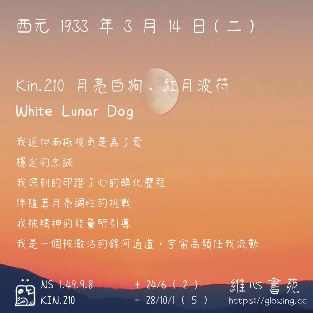 我們可以稱 KIN 210 為 【月亮白狗】 、 【月亮的白狗】 、 【紅月波符 之 月亮白狗】 也可以是 【月亮白狗.紅月波符】 ,你比較喜歡哪一個稱號呢?