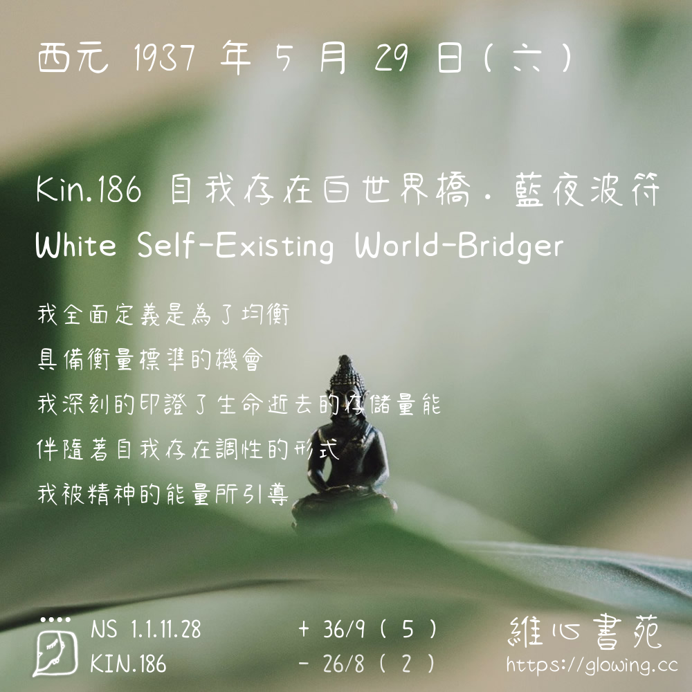 我們可以稱 KIN 186 為 【自我存在白世界橋】 、 【自我存在的白世界橋】 、 【藍夜波符 之 自我存在白世界橋】 也可以是 【自我存在白世界橋.藍夜波符】 ,你比較喜歡哪一個稱號呢?