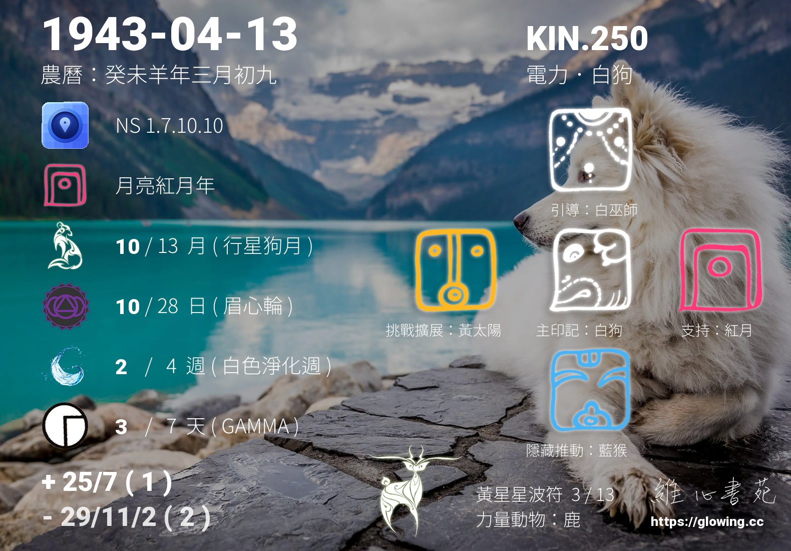 今天的星際原型圖騰為白狗,我們稱之為主印記, 白狗的主題是愛與忠誠,總是給人一種全然付出不求回報的感受,然而請千萬記得唯有先愛自己才能給予他人全然的愛是永恆的真理。