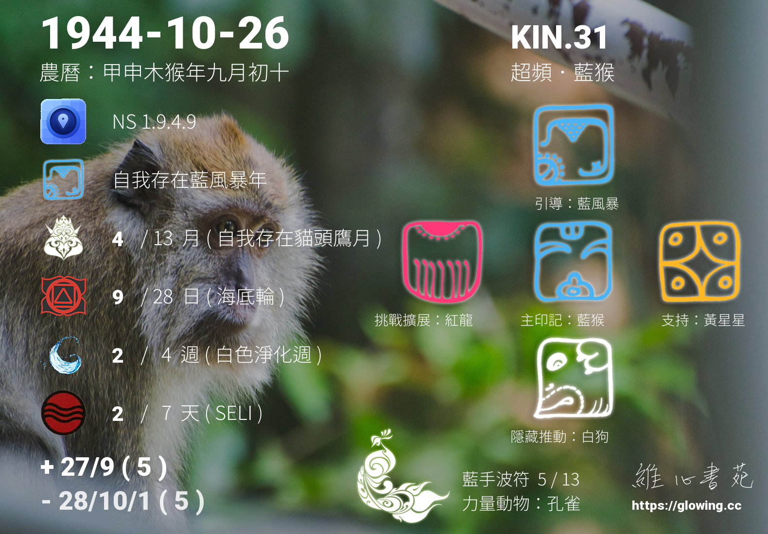 我們可以稱 KIN 31 為 【超頻藍猴】 、 【超頻的藍猴】 、 【藍手波符 之 超頻藍猴】 也可以是 【超頻藍猴.藍手波符】 ,你比較喜歡哪一個稱號呢?