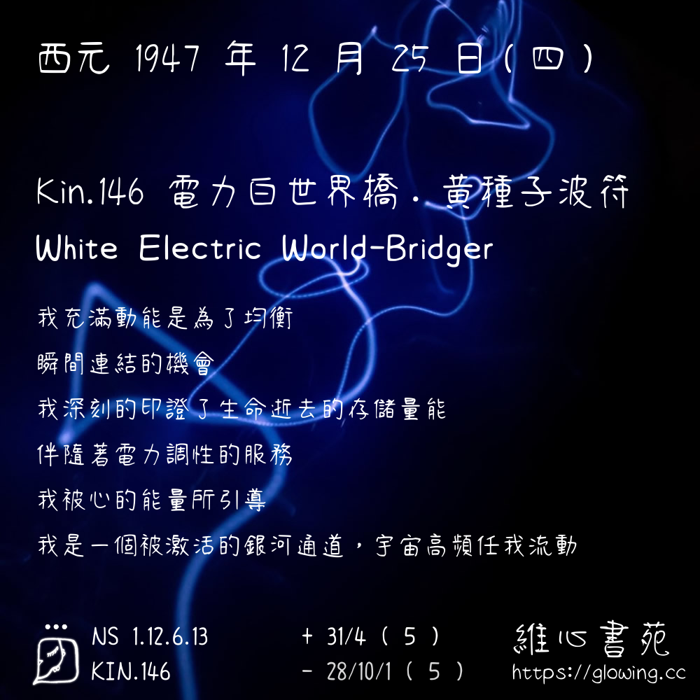 我們可以稱 KIN 146 為 【電力白世界橋】 、 【電力的白世界橋】 、 【黃種子波符 之 電力白世界橋】 也可以是 【電力白世界橋.黃種子波符】 ,你比較喜歡哪一個稱號呢?