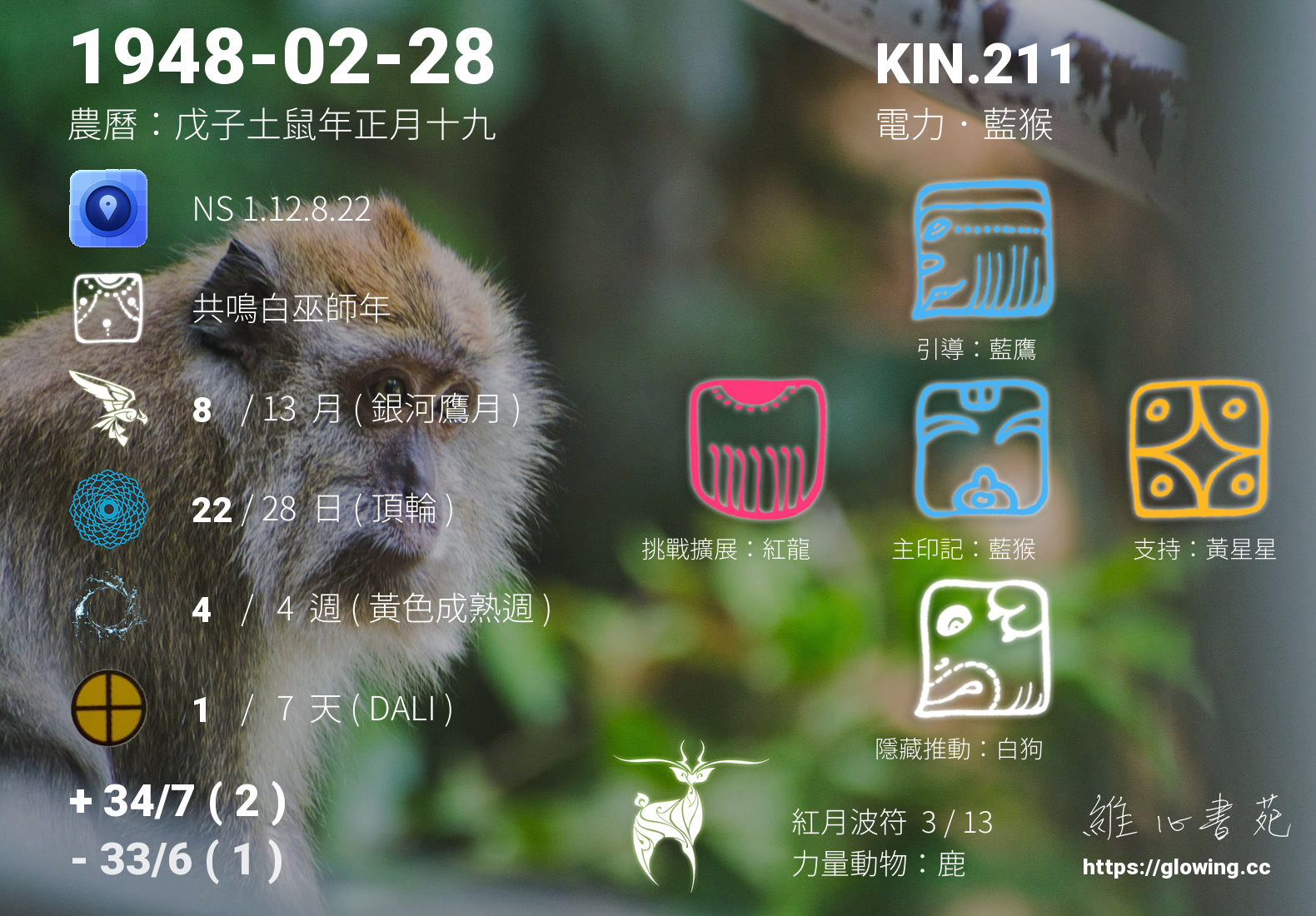 我們可以稱 KIN 211 為 【電力藍猴】 、 【電力的藍猴】 、 【紅月波符 之 電力藍猴】 也可以是 【電力藍猴.紅月波符】 ,你比較喜歡哪一個稱號呢?
