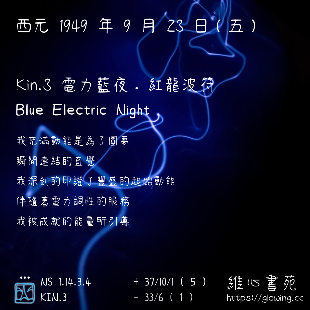 我們可以稱 KIN 3 為 【電力藍夜】 、 【電力的藍夜】 、 【紅龍波符 之 電力藍夜】 也可以是 【電力藍夜.紅龍波符】 ,你比較喜歡哪一個稱號呢?