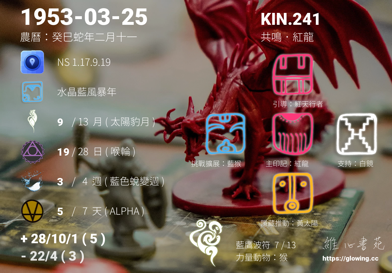今天的星際原型圖騰為紅龍,我們稱之為主印記, 紅龍是卓爾金曆的第一個圖騰,代表著生命的起源與創造,跟家庭的緣分深刻,動能豐沛。