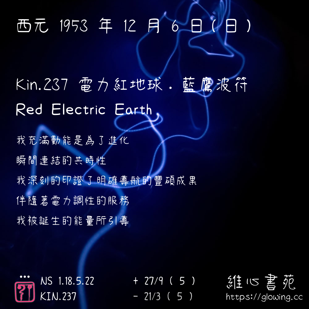 我們可以稱 KIN 237 為 【電力紅地球】 、 【電力的紅地球】 、 【藍鷹波符 之 電力紅地球】 也可以是 【電力紅地球.藍鷹波符】 ,你比較喜歡哪一個稱號呢?