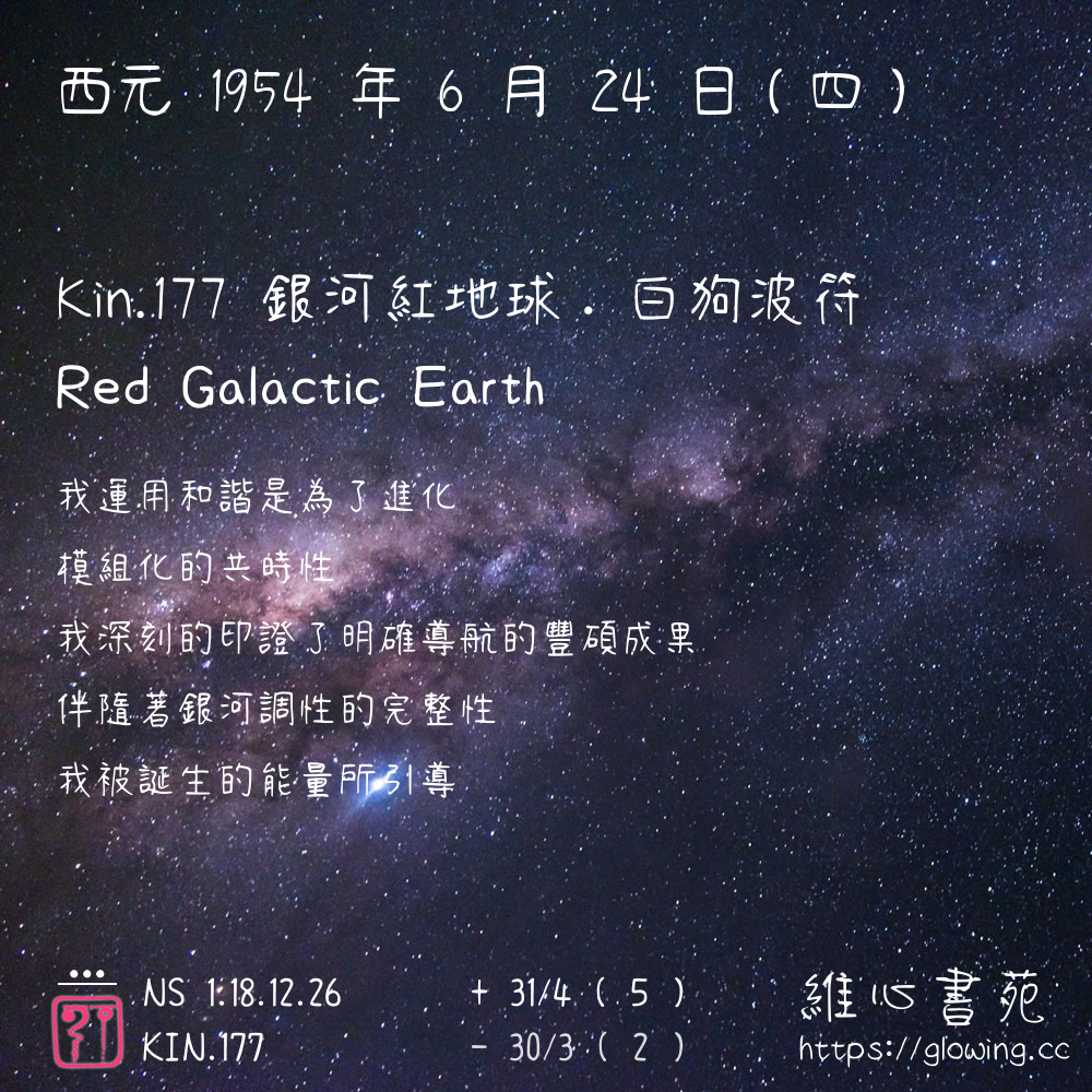 我們可以稱 KIN 177 為 【銀河紅地球】 、 【銀河的紅地球】 、 【白狗波符 之 銀河紅地球】 也可以是 【銀河紅地球.白狗波符】 ,你比較喜歡哪一個稱號呢?