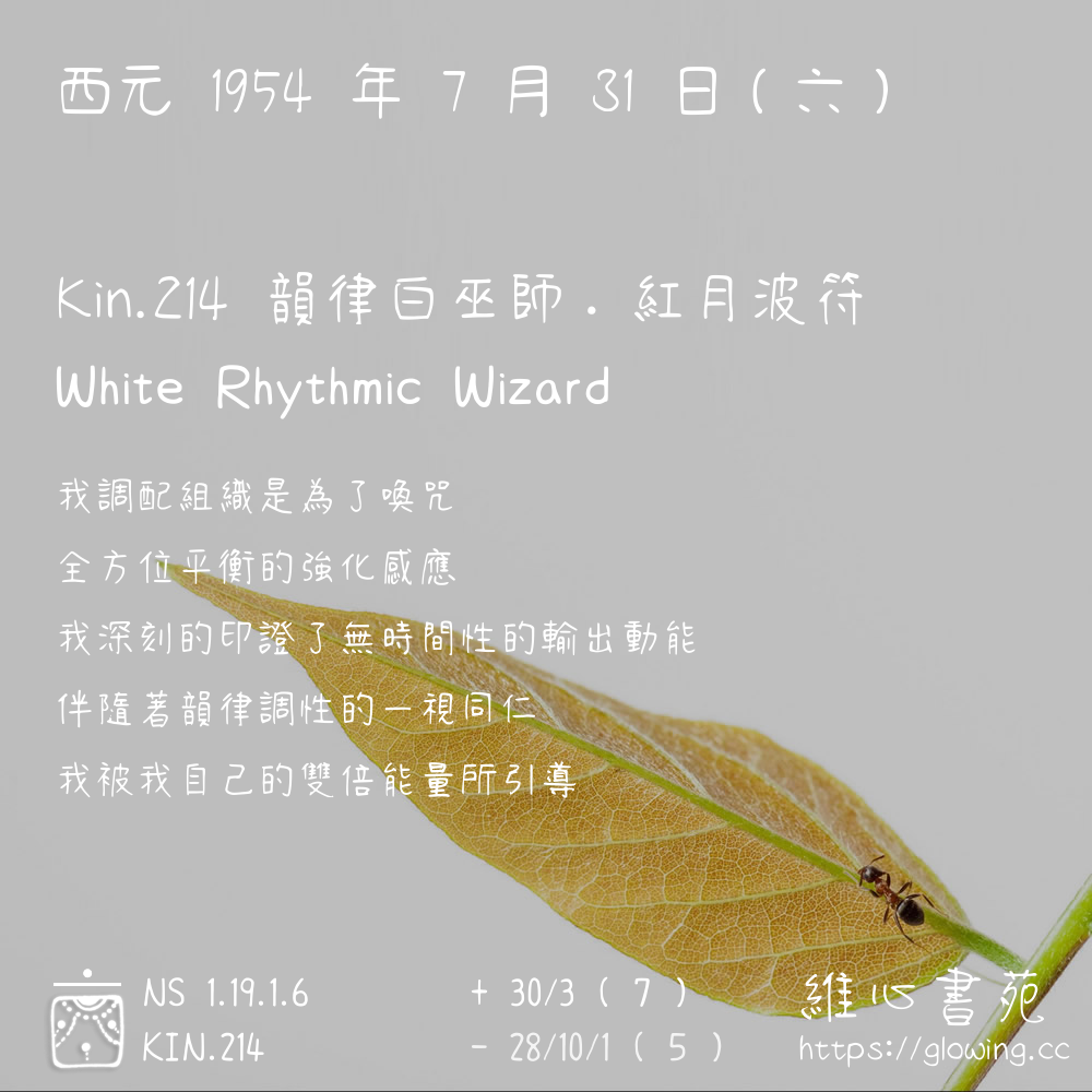 我們可以稱 KIN 214 為 【韻律白巫師】 、 【韻律的白巫師】 、 【紅月波符 之 韻律白巫師】 也可以是 【韻律白巫師.紅月波符】 ,你比較喜歡哪一個稱號呢?