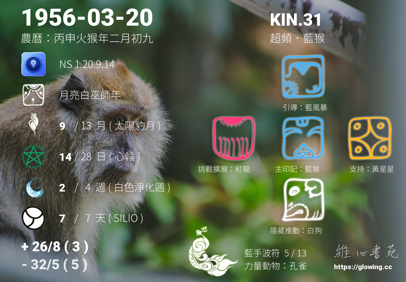我們可以稱 KIN 31 為 【超頻藍猴】 、 【超頻的藍猴】 、 【藍手波符 之 超頻藍猴】 也可以是 【超頻藍猴.藍手波符】 ,你比較喜歡哪一個稱號呢?