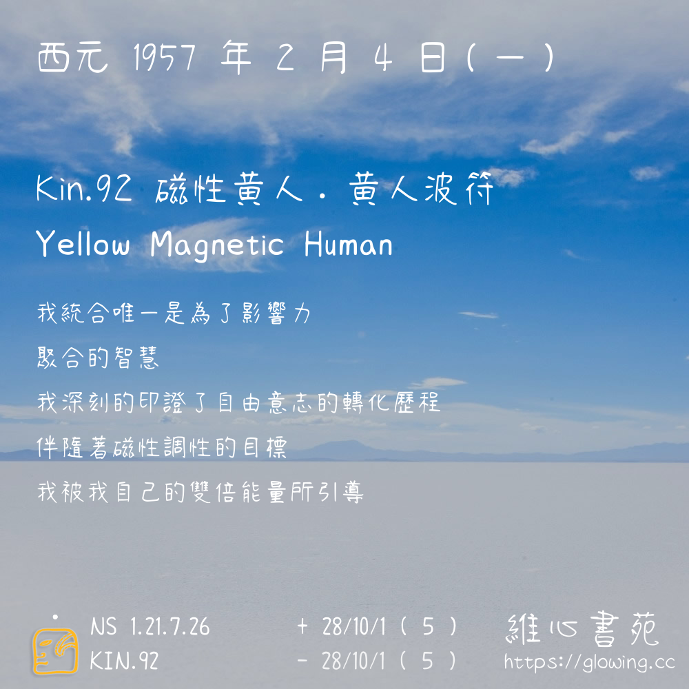 我們可以稱 KIN 92 為 【磁性黃人】 、 【磁性的黃人】 、 【黃人波符 之 磁性黃人】 也可以是 【磁性黃人.黃人波符】 ,你比較喜歡哪一個稱號呢?