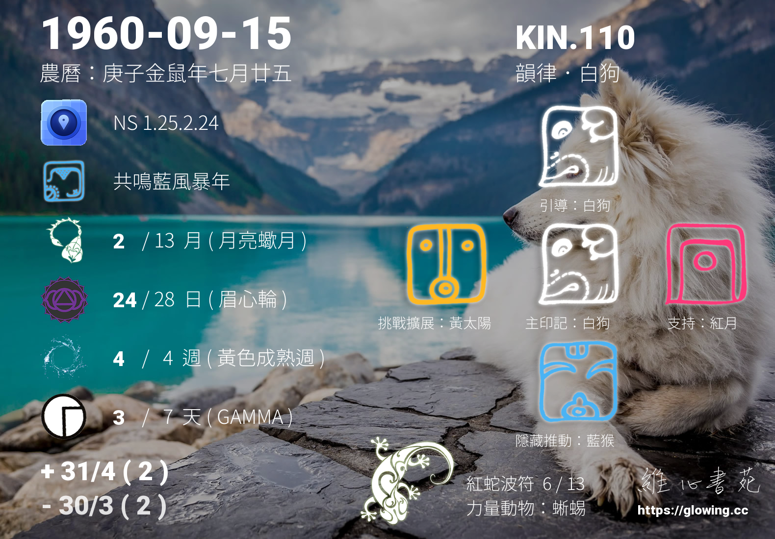 白狗的引導依據KIN的調性不同會有五種可能性,KIN.110的引導圖騰是白狗 , 沒有白狗的引導,我們沒有辦法體會到具象的愛,真實的能量流動,需要伴隨著具象的行為模式,白狗的愛相當的純粹、自然且生動現實,我們可以全然的接受,那發自內心毫無一絲污漬的潔淨純白。