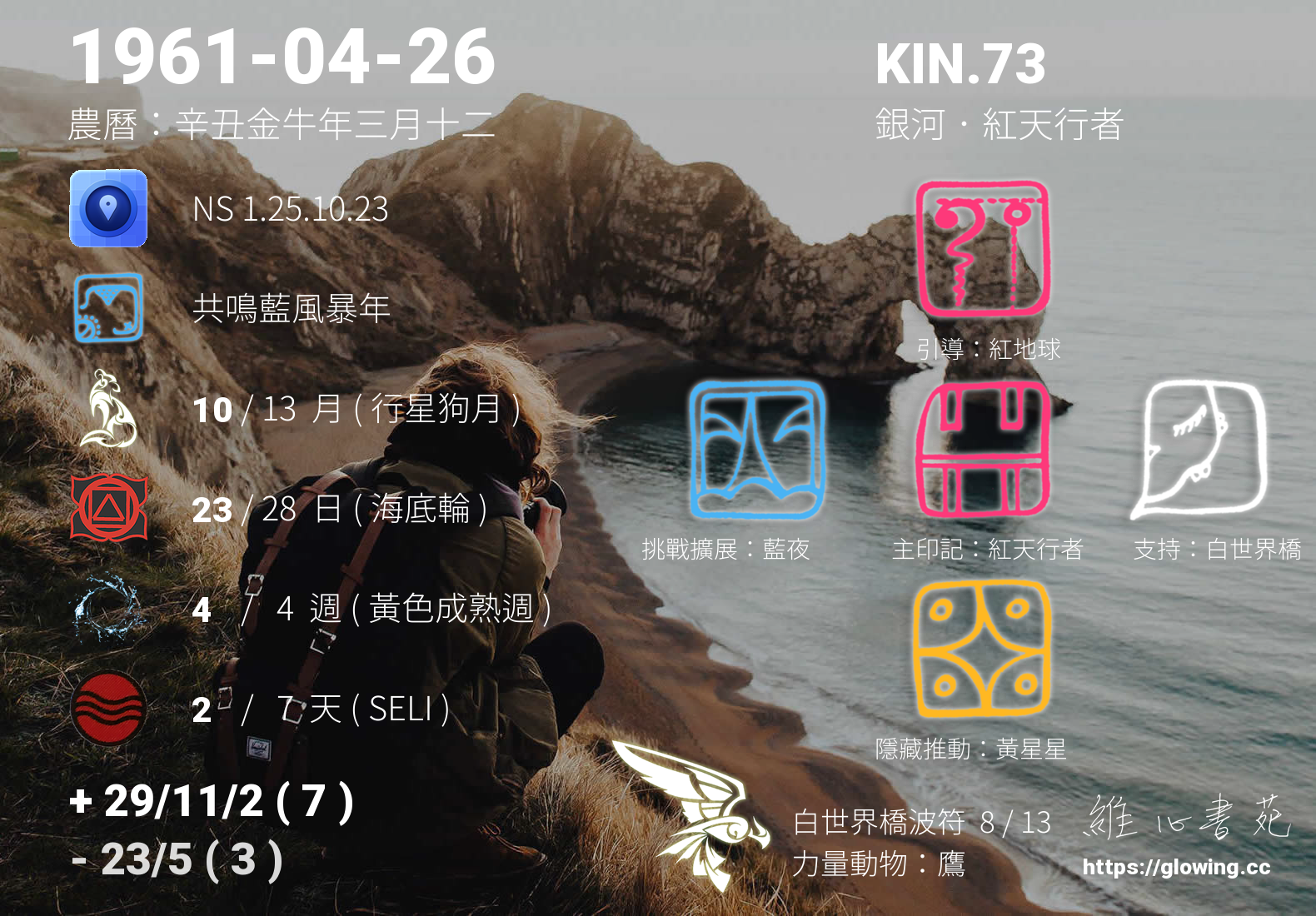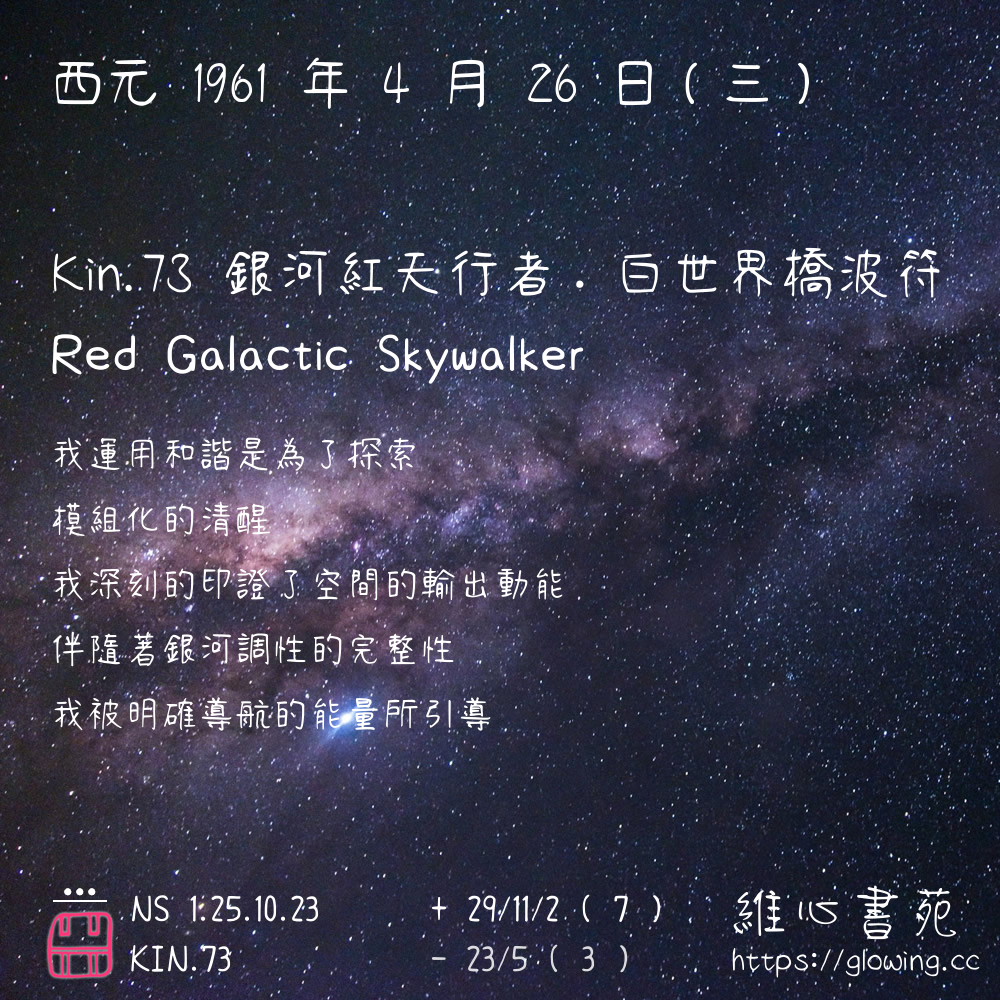 我們可以稱 KIN 73 為 【銀河紅天行者】 、 【銀河的紅天行者】 、 【白世界橋波符 之 銀河紅天行者】 也可以是 【銀河紅天行者.白世界橋波符】 ,你比較喜歡哪一個稱號呢?