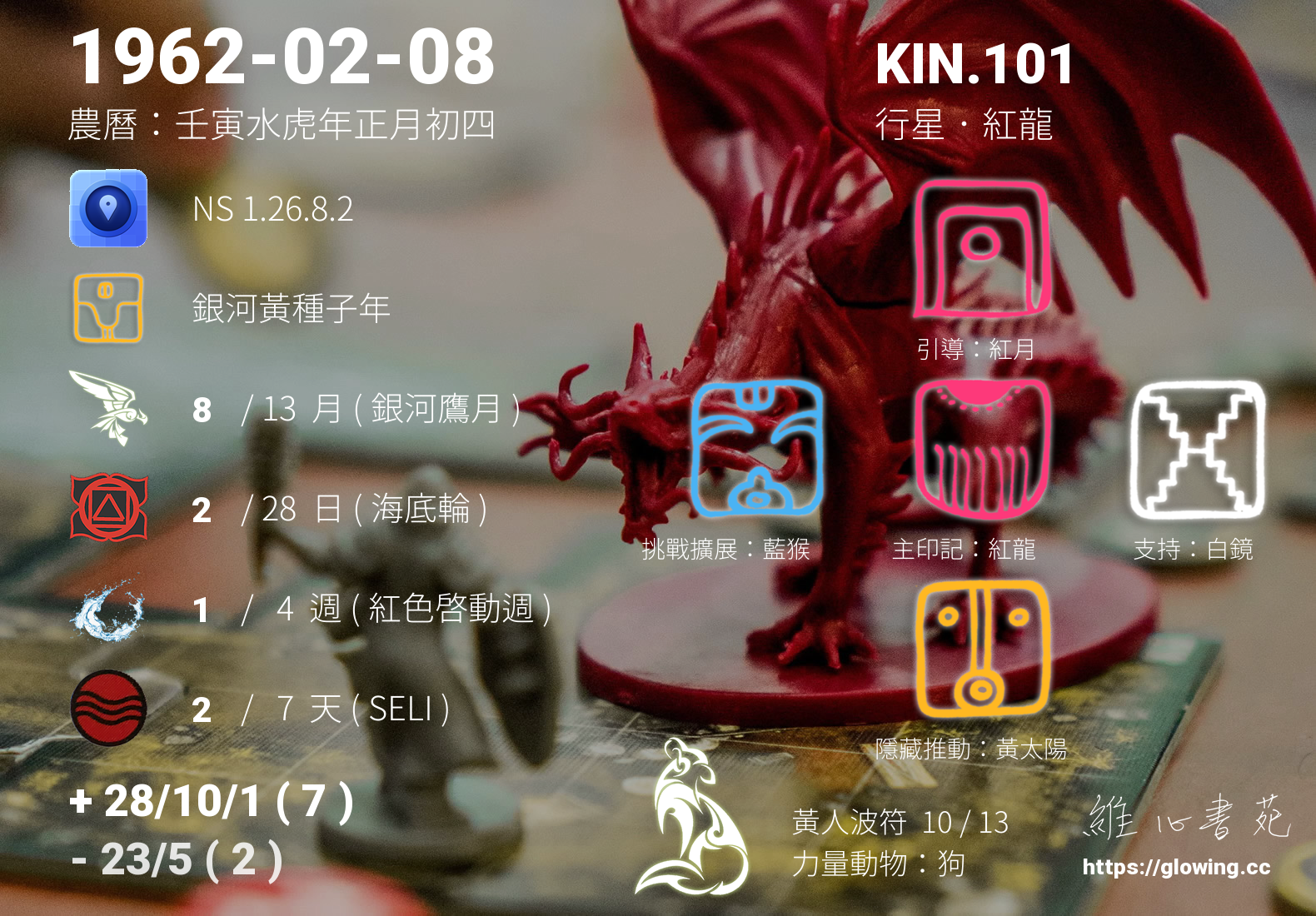 今天的星際原型圖騰為紅龍,我們稱之為主印記, 紅龍是卓爾金曆的第一個圖騰,代表著生命的起源與創造,跟家庭的緣分深刻,動能豐沛。